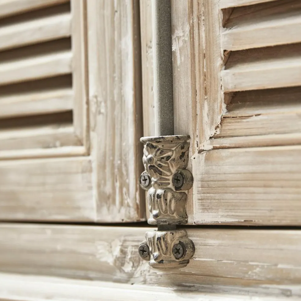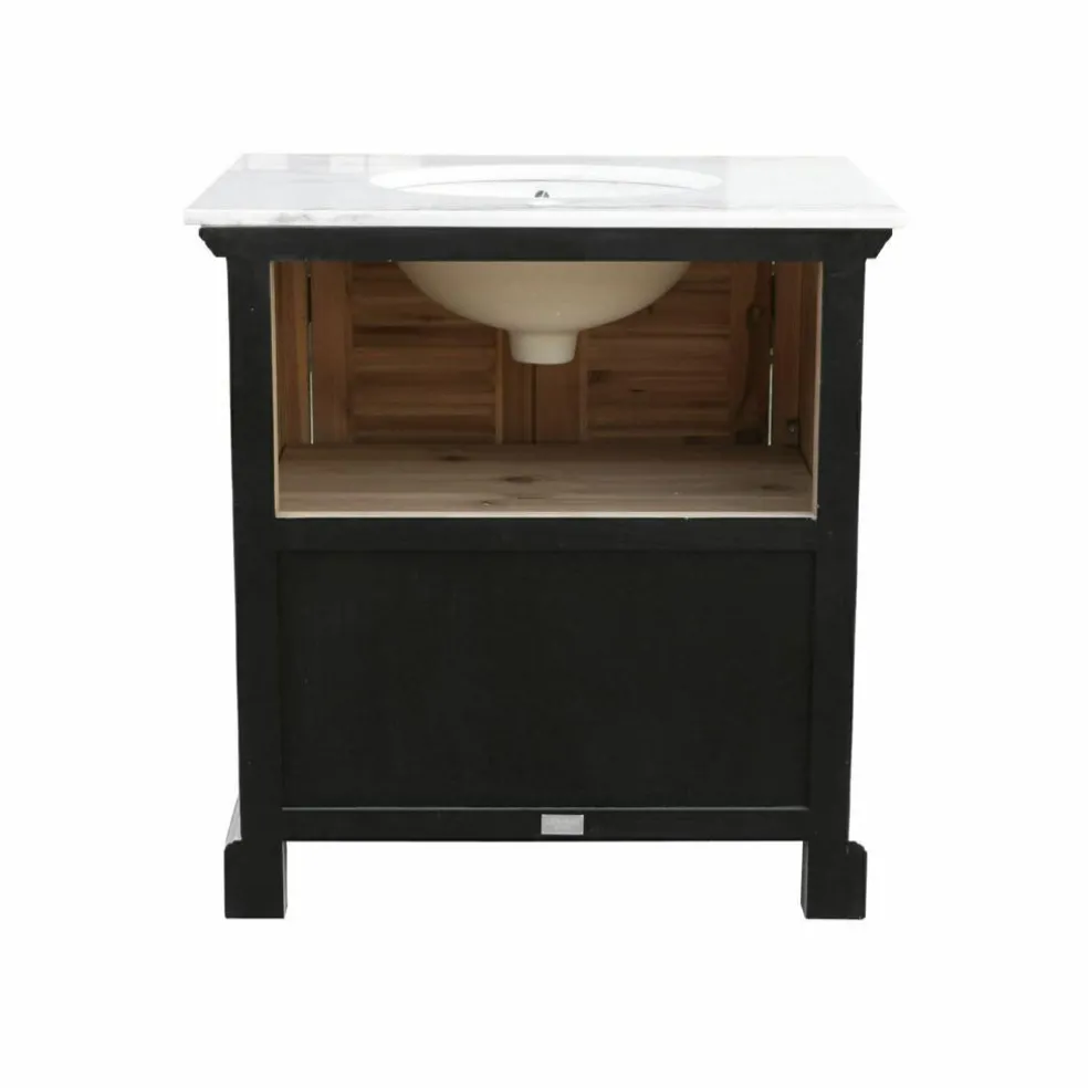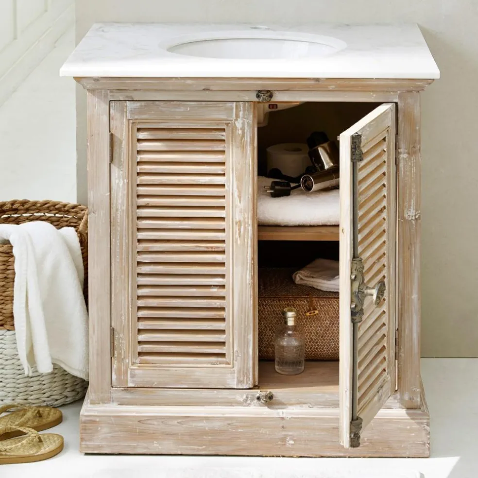 Avec ce superbe plan vasque, votre salle de bains volera la vedette aux autres pièces de la maison. Les matières travaillées avec habileté s’assemblent pour former un ensemble esthétique. Le caisson et les portes de cet incontournable des amateurs du style shabby chic sont confectionnées en véritable bois de sapin. La finition travaillée du bois ajoute une touche de charme vintage. La vasque en céramique est entourée d’un élégant plateau en marbre de grande qualité. Les merveilleuses portes à lames ajourées se ferment grâce à une fermeture à barreau ornée. À l’intérieur du meuble, vous pourrez ranger votre trousse de toilette, votre brosse, vos crèmes et vos lotions. Vous pouvez également stocker serviettes, gants, brosses à dents et sèche-cheveux derrière ces jolies portes. Votre salle de bains restera bien rangée et agréable. L’aspect harmonieux du meuble sera une pièce maîtresse dans la création d’une salle de bains à l’ambiance sereine. La tablette amovible vous permet de ranger de plus grands objets dans le meuble. Une surface de rangement spacieuse, qui saura vous convaincre par sa fonctionnalité comme par son aspect.