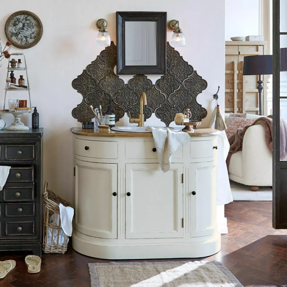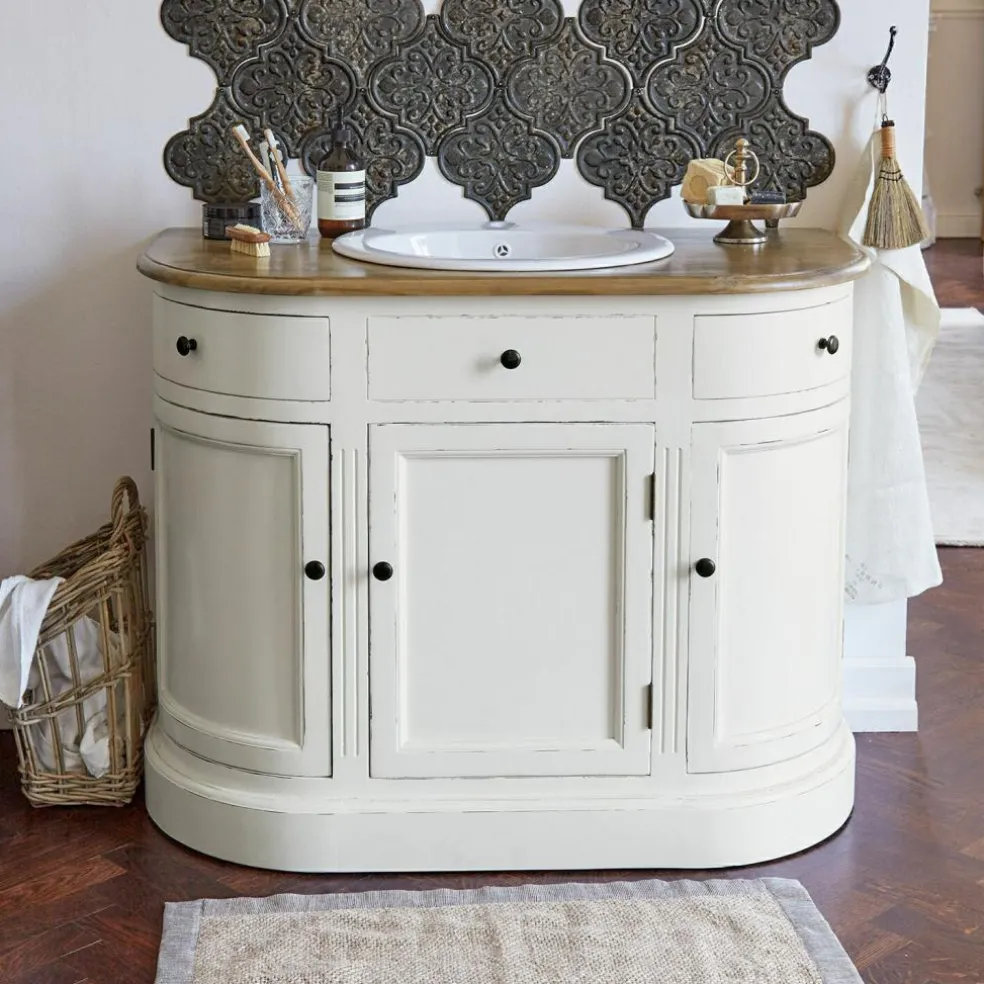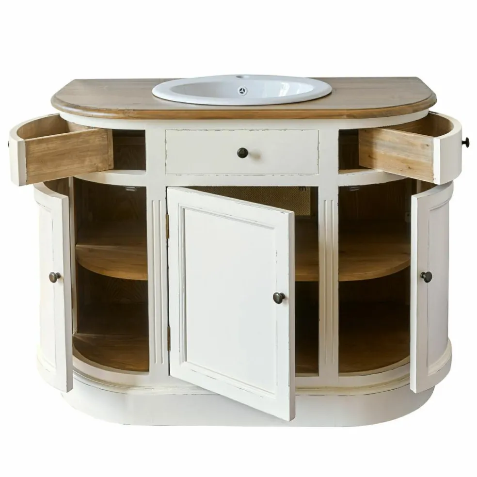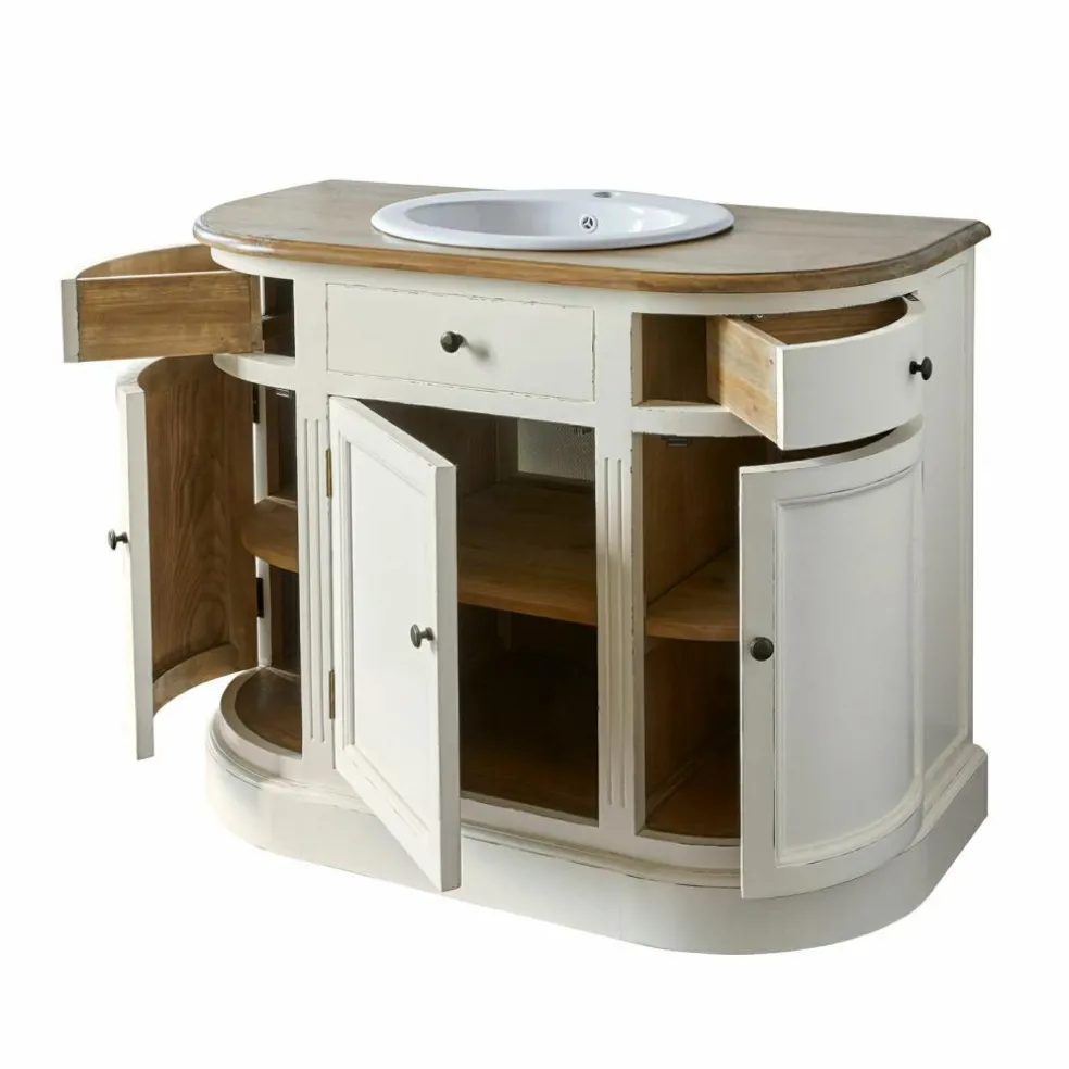 Ce meuble de salle de bains capte le meilleur des deux mondes : l’aspect rustique du bois de sapin revalorisé et la pure élégance de la céramique. Le meuble à la surface blanc vieilli séduit par son charme vintage tandis l’intérieur laissé au naturel et le plateau solide rendent hommage à la beauté du bois. L’espace derrière les portes et les deux tiroirs latéraux offre de beaux rangements. Plus qu’un simple meuble de salle de bains, il s’agit d’un petit bijou fonctionnel à la beauté intemporelle.