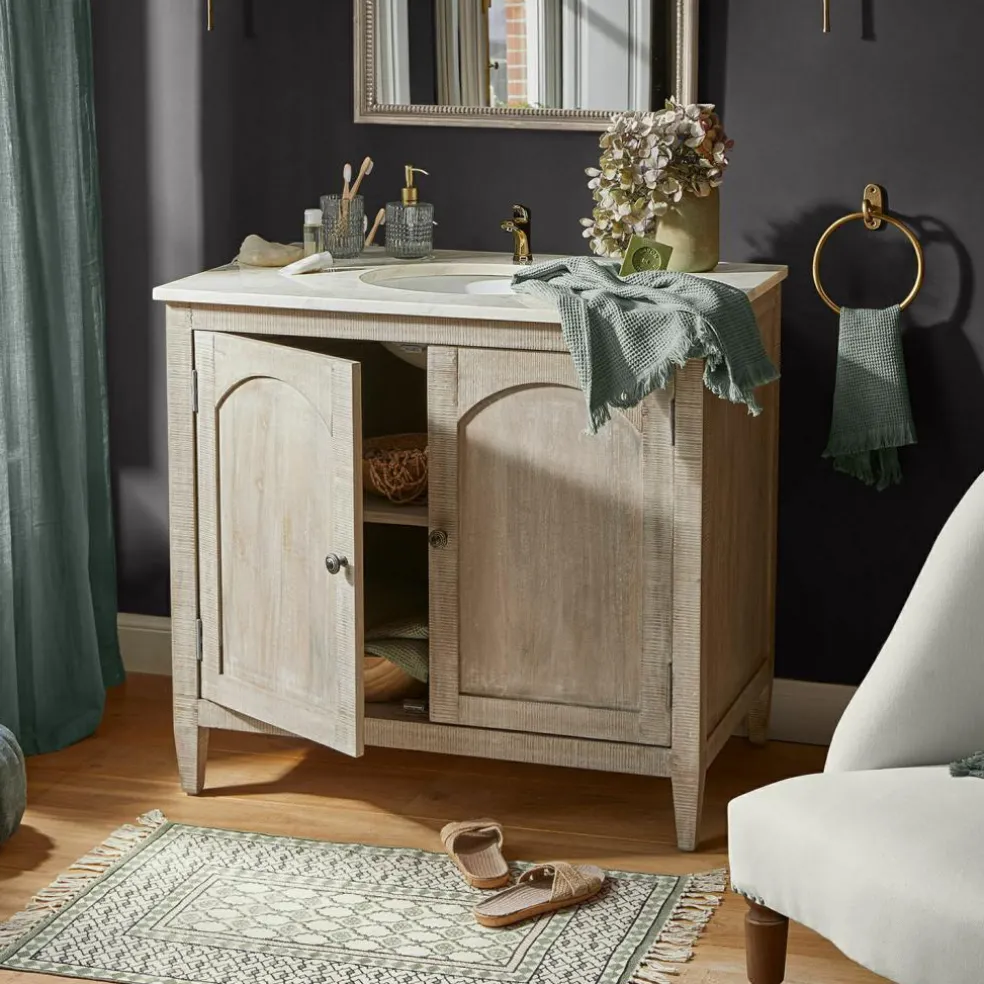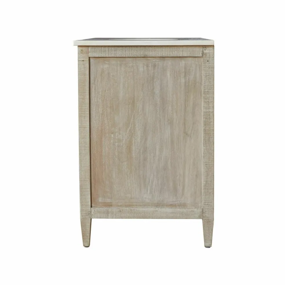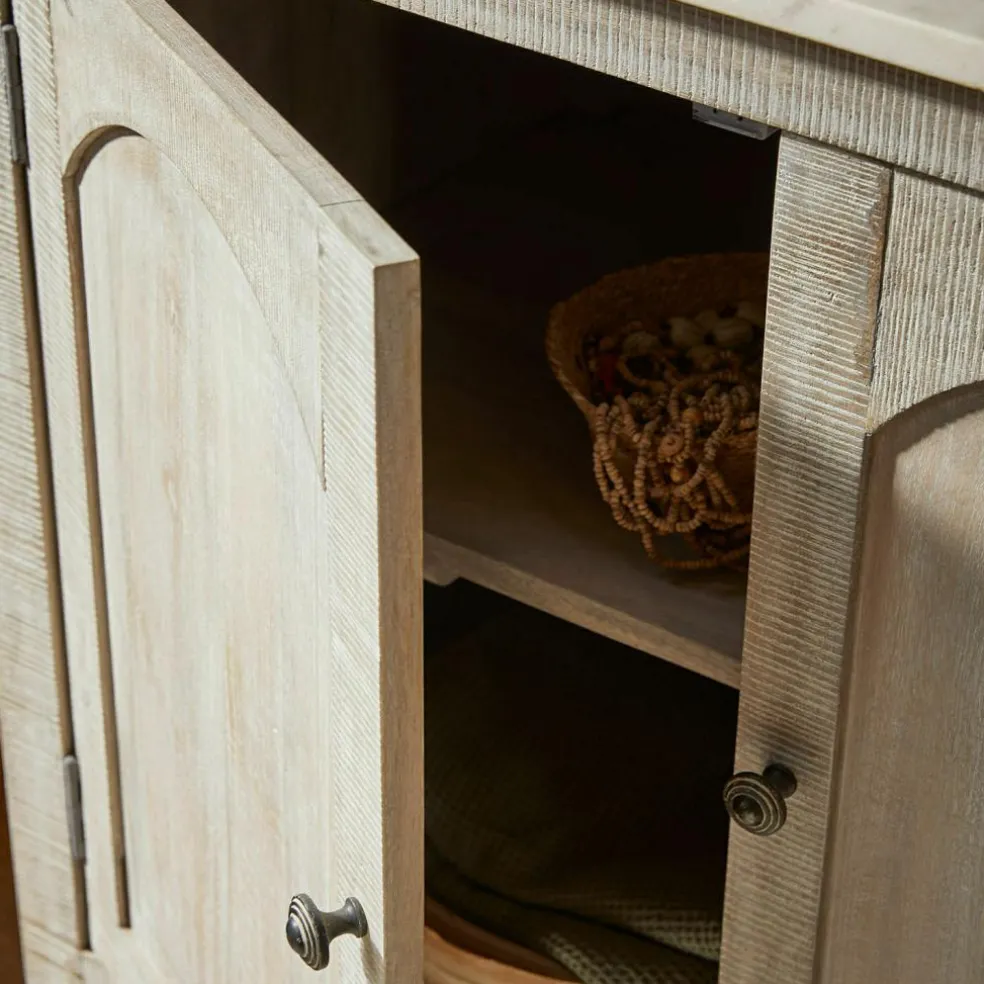 Les amateurs d’originalité trouveront leur bonheur avec ce meuble à vasque : la combinaison entre le bois véritable avec une surface cérusée et un aspect rainuré finement structuré crée un sentiment d’authenticité – comme dans une charmante maison de campagne. Le plan en marbre de qualité supérieure séduit par son veinage naturel et confère au meuble une note intemporelle. La vasque en céramique délicatement encastrée brille par ses lignes épurées et sa fonctionnalité. La conception de la façade, avec ses panneaux incurvés et ses boutons métalliques arrondis, est particulièrement détaillée. Ce meuble de salle de bains est plus que fonctionnel et fait preuve d’authenticité.