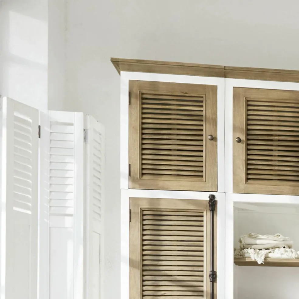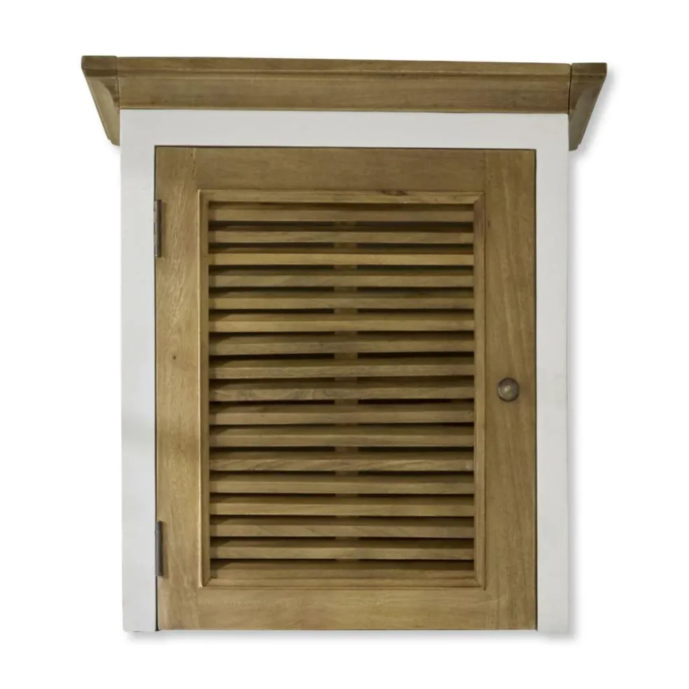 Ce meuble haut d’une porte est le complément parfait des armoires étroites de l’ensemble en bois de manguier: le modèle 19352 et la variante 19353 avec des tiroirs. Cette extension se présente sous forme de cube charmant et offre encore plus de place, par exemple pour des torchons, des plaids, des housses de couette et des draps. Lorsque l’on a de la place en hauteur, le meuble est idéal pour utiliser la place disponible et avoir de l’espace de stockage supplémentaire. Comme les autres parties de l’ensemble, le cube est entièrement fabriqué à la main en bois de manguier, avec son aspect de lamelles si singulier. Le meuble permet deux variantes: la porte peut s’ouvrir vers la gauche ou vers la droite. Vous pouvez donc le placer où bon vous semble. Son design épuré s’intègre harmonieusement dans l’ensemble, tout en étant très pratique. Comme les corniches et les socles du système sont amovibles pour tous les composants, le meuble peut être fixé très facilement à l’armoire. Les baguettes permettent aux différents composants de se fondre joliment dans les armoires assorties.