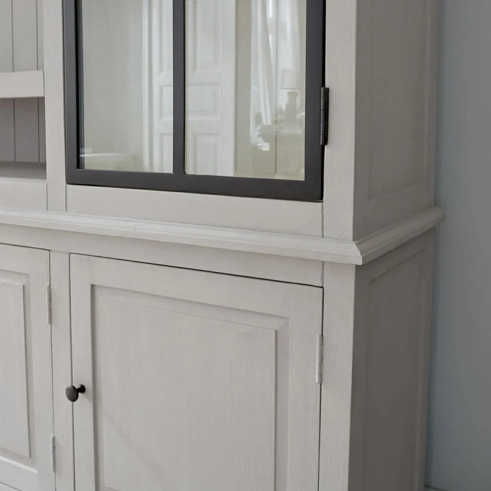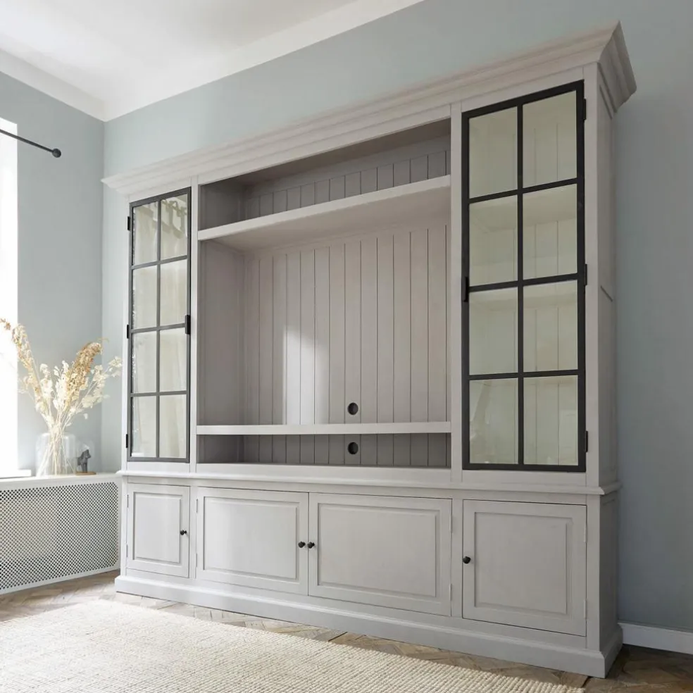 Style maison de campagne avec une touche industrielle. Les portes pourvues de délicats croisillons métalliques forment un point de contraste tendance avec les moulures décoratives caractéristiques du style maison de campagne. Les compartiments ouverts et fermés offrent de beaux rangements. Tradition et modernité cohabitent ici habilement et confèrent à ce meuble de style maison de campagne classique une facette intéressante. Il émane de ce meuble un esprit cosy qui fleure bon la campagne et qui apportera une note chaleureuse à votre intérieur. Les deux portes vitrées contrastent joliment avec l’ensemble et rappellent les grandes fenêtres vitrées que l’on trouvait dans les anciens ateliers. Si elles servaient autrefois à laisser entrer un maximum de lumière naturelle pour éclairer les établis, elles ont ici le pouvoir de mettre joliment en vitrine tous les objets que vous placerez derrière. Dans le grand espace au milieu du meuble qui, tout comme les éléments latéraux présente une paroi arrière lamellée de couleur blanche, vous pourrez installer votre téléviseur, votre chaîne-hifi etc : des ouvertures ont spécialement été pensées pour le passage des câbles. Et s’il vous reste encore quantité de choses que vous souhaitez entreposer au salon mais que vous préférez garder cachées, alors rangez-les dans les compartiments fermés par de jolies portes à cassettes.