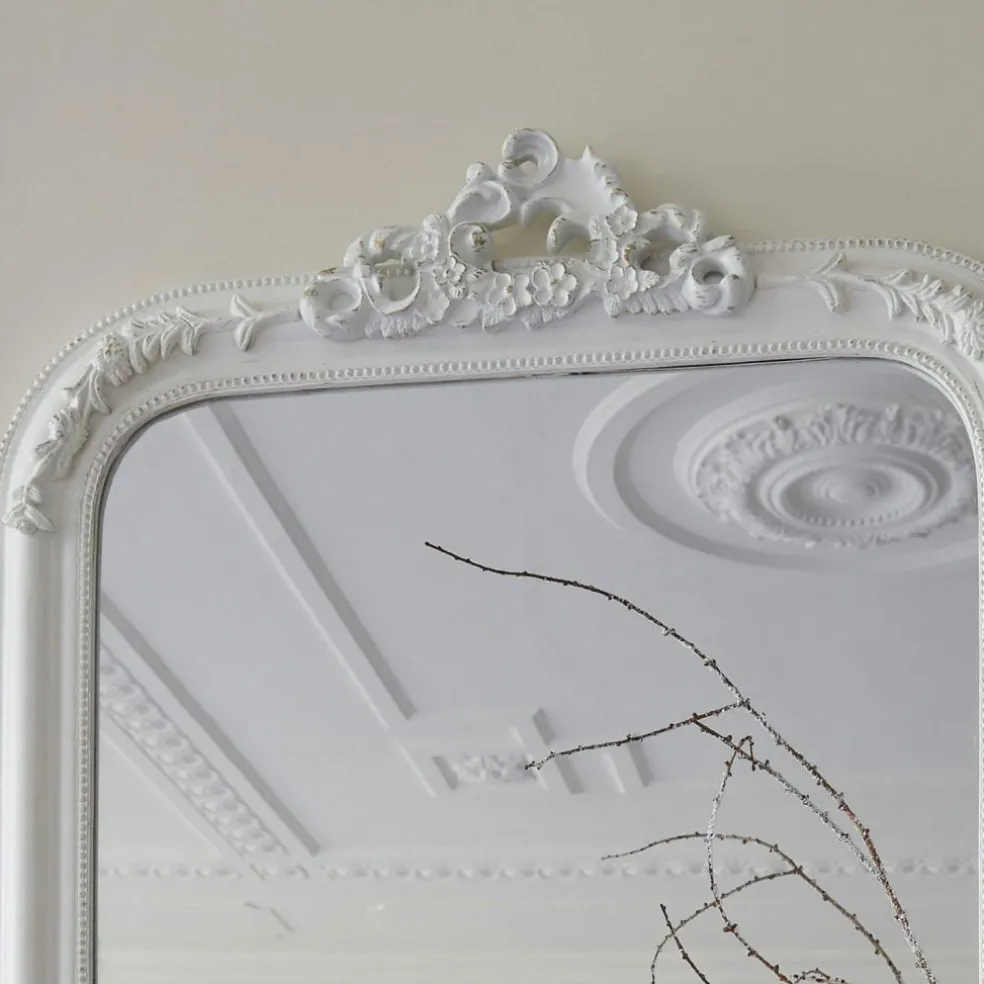 Bien qu’aujourd’hui ce sont les intérieurs minimalistes et fonctionnels qui prédominent, nombreux sont ceux qui rêvent d’un habitat élégant, de bois nobles et de meubles dont les fins détails laissent entrevoir l’amour du créateur pour ses œuvres. Ce miroir, avec ses formes légères et ses décorations exubérantes, rappelle les fenêtres de la Belle Époque, lorsque l’architecture n’était jamais assez somptueuse. Le cadre, orné d’un fin ruban de perles, est fabriqué en bois de paulownia, un bois noble très dur et résistant, volontiers utilisé pour les meubles et les instruments de musique haut de gamme. Petite particularité : les éléments décoratifs floraux ne sont pas sculptés dans du bois, mais dans du stuc, comme ceux qui ornaient à l’époque les murs et les plafonds des salons élégants et que l’on peut encore admirer aujourd’hui dans certains appartements et certaines maisons. Le fini blanc vieilli vient compléter son éclat nostalgique et perfectionne l’effet éblouissant de cette pièce maîtresse de luxe. Vous avez la possibilité de poser le miroir sur une commode ou une console ou de l’accrocher – dans le hall d’entrée, le salon ou la chambre – grâce aux deux crochets fournis.