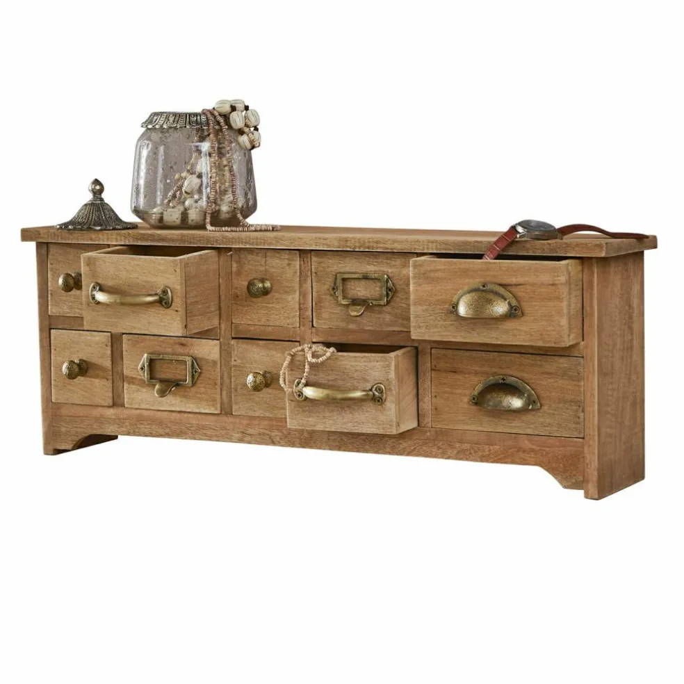 Cet organiseur ressemblant à une petite commode allie fonctionnalité et beauté naturelle. Le bois de manguier clair apporte une touche chaleureuse et authentique à n’importe quelle pièce. Les neuf tiroirs offrent non seulement un espace de rangement pour les petits objets, mais peuvent également être entièrement retirés pour transformer l’organiseur en une étagère ouverte. Particulièrement charmant: les différents styles de poignées confèrent au meuble une dynamique particulière. Accrochez-le au mur pour gagner de l’espace ou utilisez-le debout comme point de mire décoratif: un vrai caméléon pour votre maison.
