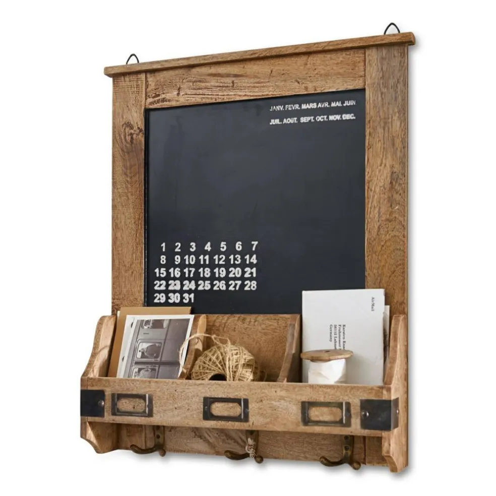 Avec un calendrier et un tableau noir inscriptible. Bois de manguier massif avec de nobles éléments en fer. Un superbe organiseur mural doté de trois compartiments pour ranger le courrier, de crochets pour suspendre les clefs ou les sacs et d’un tableau noir pour noter la liste de courses ou laisser des mots doux à la famille. Ce superbe rangement est réalisé à la main en bois de manguier pur qui séduit par son incroyable effet structuré.