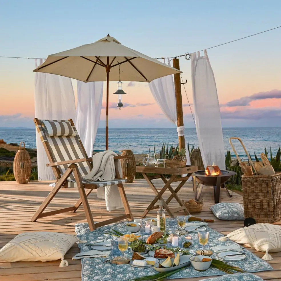Que ce soit sur un petit balcon ou dans le jardin, ce parasol de taille compacte ne lésine pas sur la qualité et vous accompagnera de nombreuses années. Le mât, les barreaux et la couronne sont fabriqués en bois d’eucalyptus massif, tandis que la toile avec cheminée de décompression intégrée est en oléfine/polyester de haute qualité, résistant à la pluie. Vous pouvez compléter cet article avec le pied à parasol assorti.