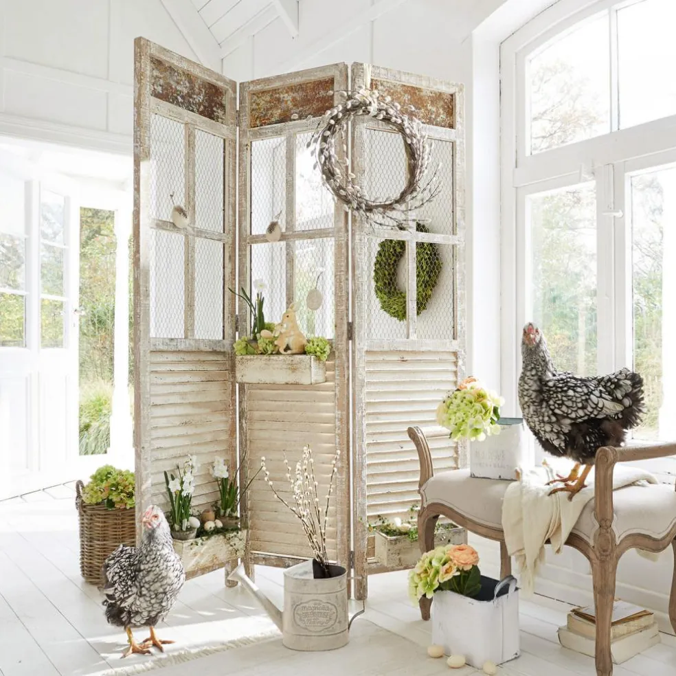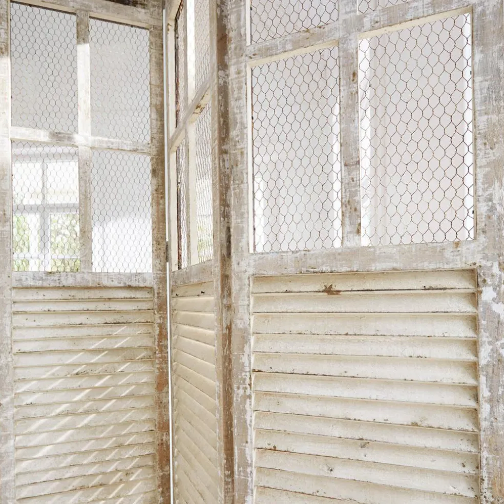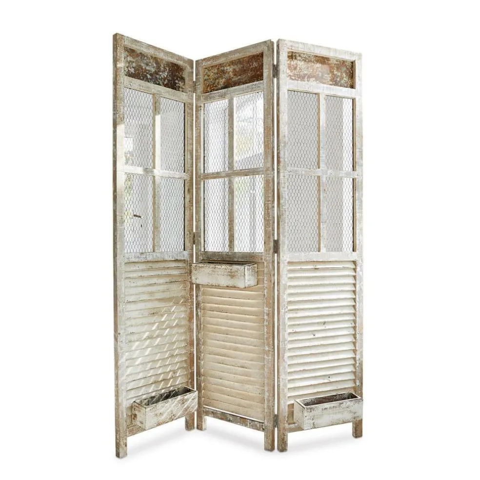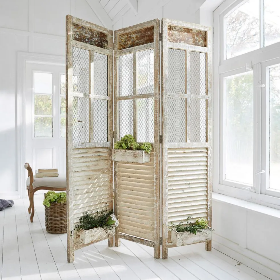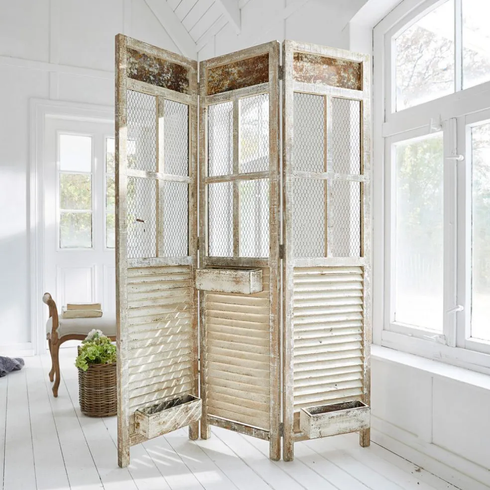 Séduit par son allure shabby authentique. Fabrication richement détaillée en bois de pin, ouvertures de fenêtres avec grillage métallique. Avec des bacs à fleurs à planter. Les meubles et des accessoires dont on devine qu’ils ont été utilisés longtemps et avec plaisir ont tendance à exercer une certaine fascination sur la plupart d’entre nous. C’est un peu s’ils nous invitaient à nous laisser aller à un exaltant voyage dans le temps. Les racines de ce paravent semblent provenir d’une maison de campagne du Sud : il présente des lamelles classiques, typiques de l’espace méditerranéen, tandis que les ouvertures sur les fenêtres affichent des croisillons traditionnels pourvus d’un grillage métallique. Si cette combinaison est aussi rare que charmante, ce paravent se distingue encore par un autre point de ses semblables : il porte fièrement trois bacs à fleurs. Cela vous permet non seulement de parer votre paravent de belles fleurs, mais aussi d’y faire grimper des plantes grimpantes qui s’accrocheront dans le grillage des fenêtres. Un séparateur d’espace estival et aérien qui saura marquer les limites entre l’intérieur et l’extérieur en toute légèreté. Confectionné avec soin en bois de pin, il a été travaillé avec une finition vieillie et affiche des traces d’usage charmantes.