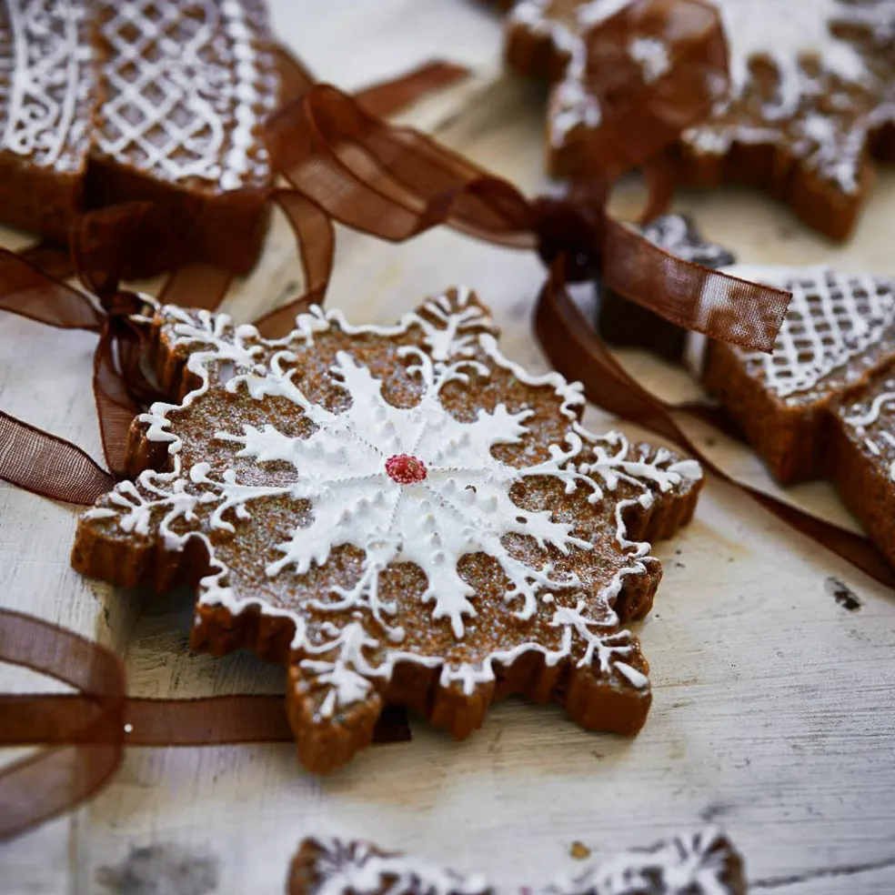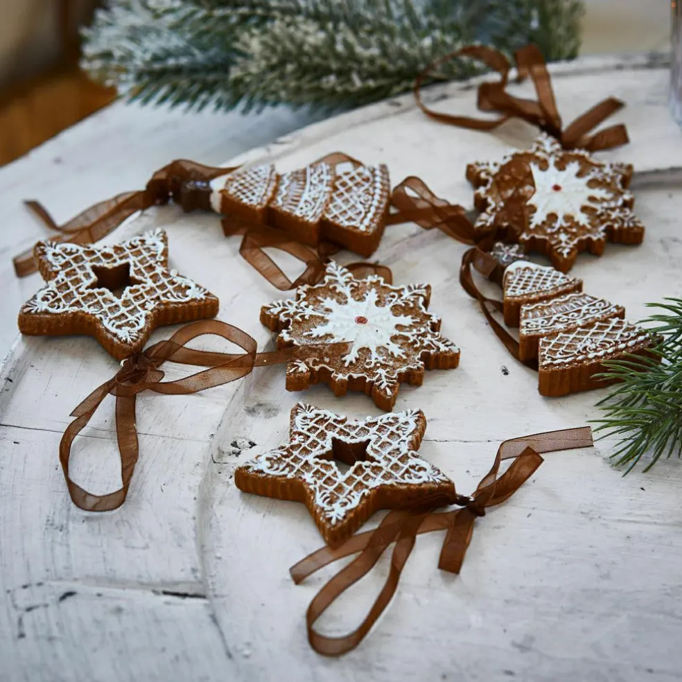 On pourrait presque croire qu’ils sortent tout juste du four, tant ces six décorations en forme d’étoiles, de flocons de neige et de sapins sont détaillées et soignées. Le fond de couleur bronze rappelle le pain d’épice cuit au four, rehaussé par des motifs blancs délicatement appliqués qui semblent être décorés avec du glaçage. Des particules scintillantes accrochent la lumière et font scintiller les ornements de manière festive. Les différentes structures en relief créent un mélange charmant d’artisanat traditionnel et de décorations féeriques. Chaque suspension est munie d’un petit ruban, prêt à être accroché aux branches, aux cadeaux ou à l’arbre de Noël pour créer des moments d’ambiance. Un ensemble qui allie chaleur, souvenirs d’enfance et éclat festif.