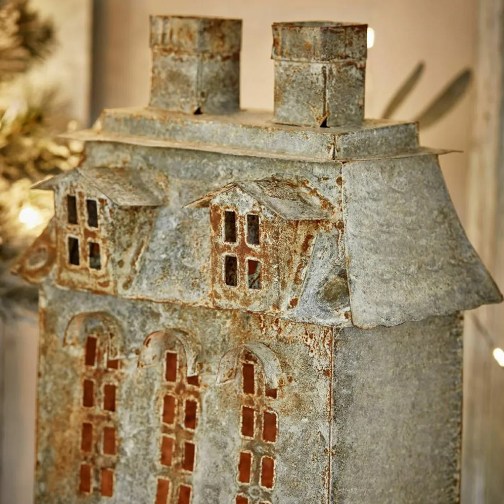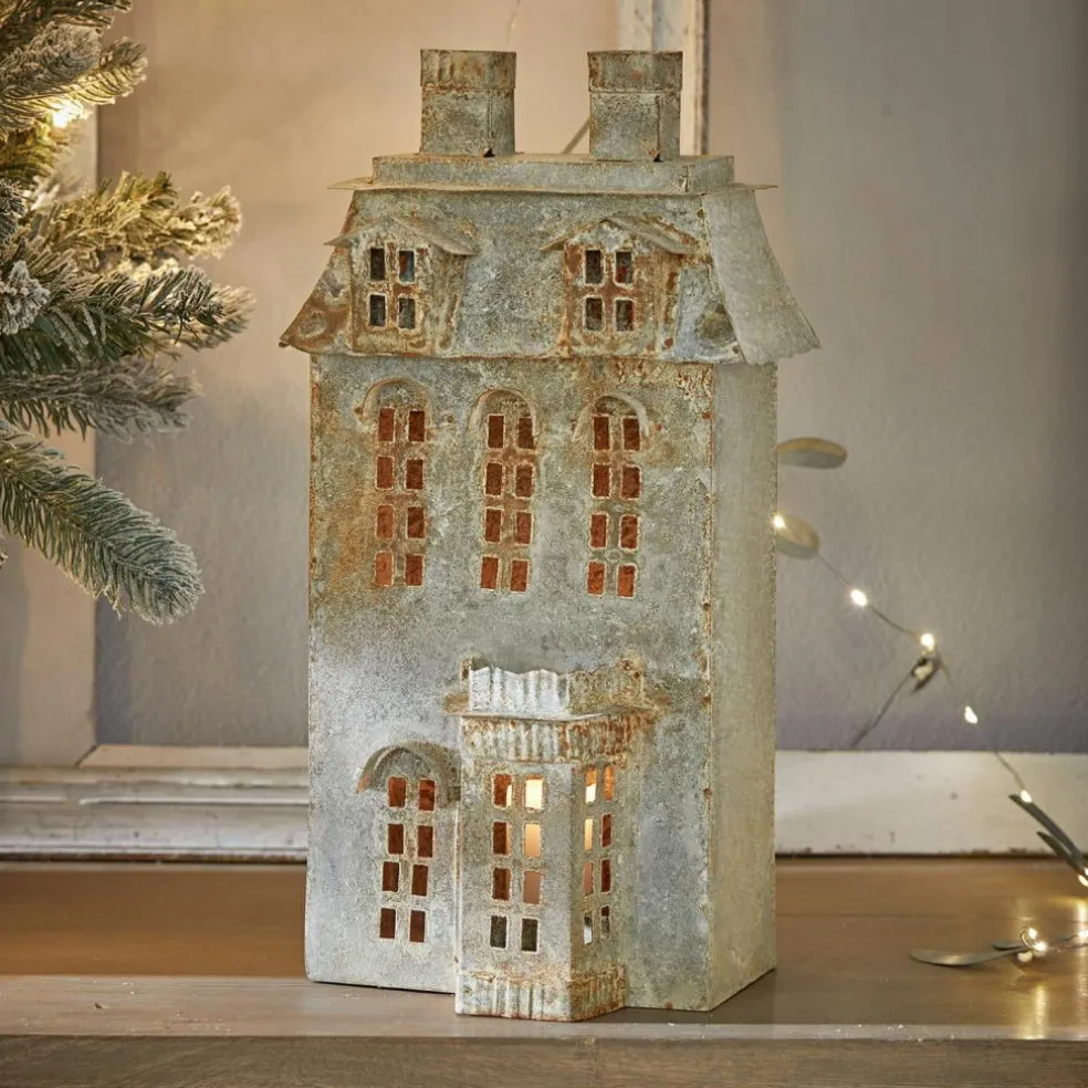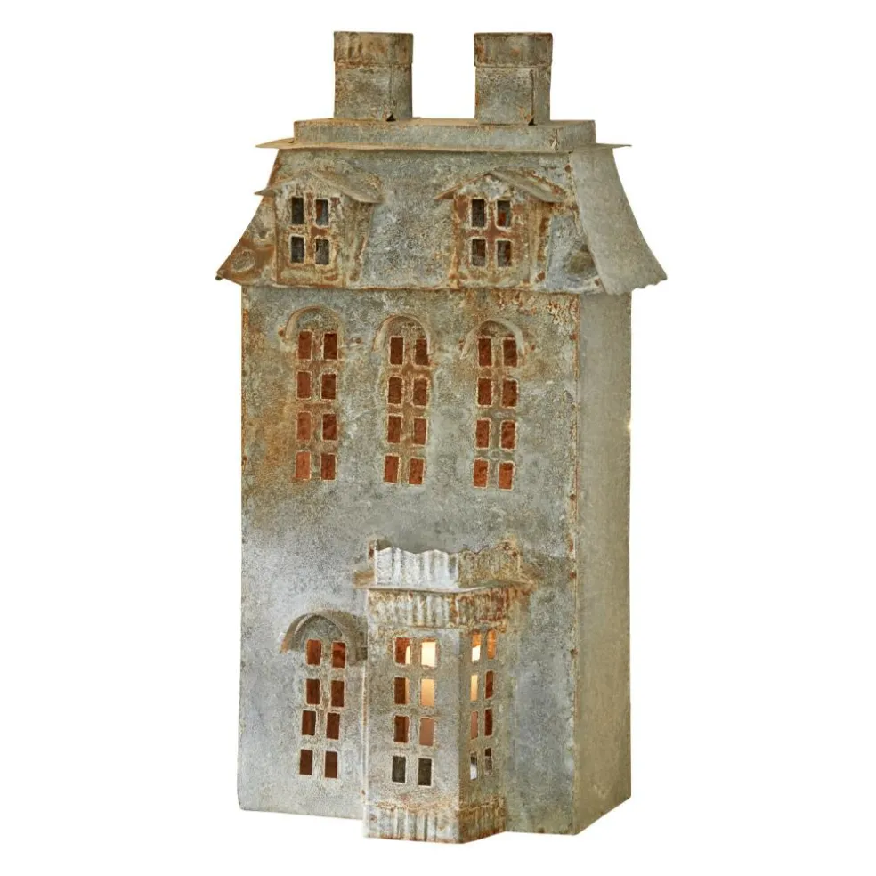 Ce photophore évoque une maison de ville enneigée tout droit sortie d’un conte de Noël ancien, anguleuse, pleine de charme, marquée par le temps. Sa patine irrégulière, mêlant des nuances de gris et de rouille, confère à la structure en fer un caractère unique et authentique. De petites fenêtres ponctuent sa façade, du toit mansardé aux lucarnes jusqu’à l’entrée finement détaillée. À l’intérieur, une bougie chauffe-plat diffuse une lueur dansante, donnant à cette maisonnette l’apparence d’un foyer habité et chaleureux. Un fragment de nostalgie qui apporte de l’âme et de la lumière, non seulement pendant les fêtes, mais partout où l’on souhaite créer une atmosphère pleine de tendresse et d’émotion.