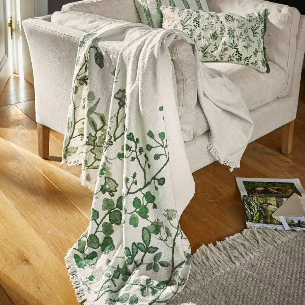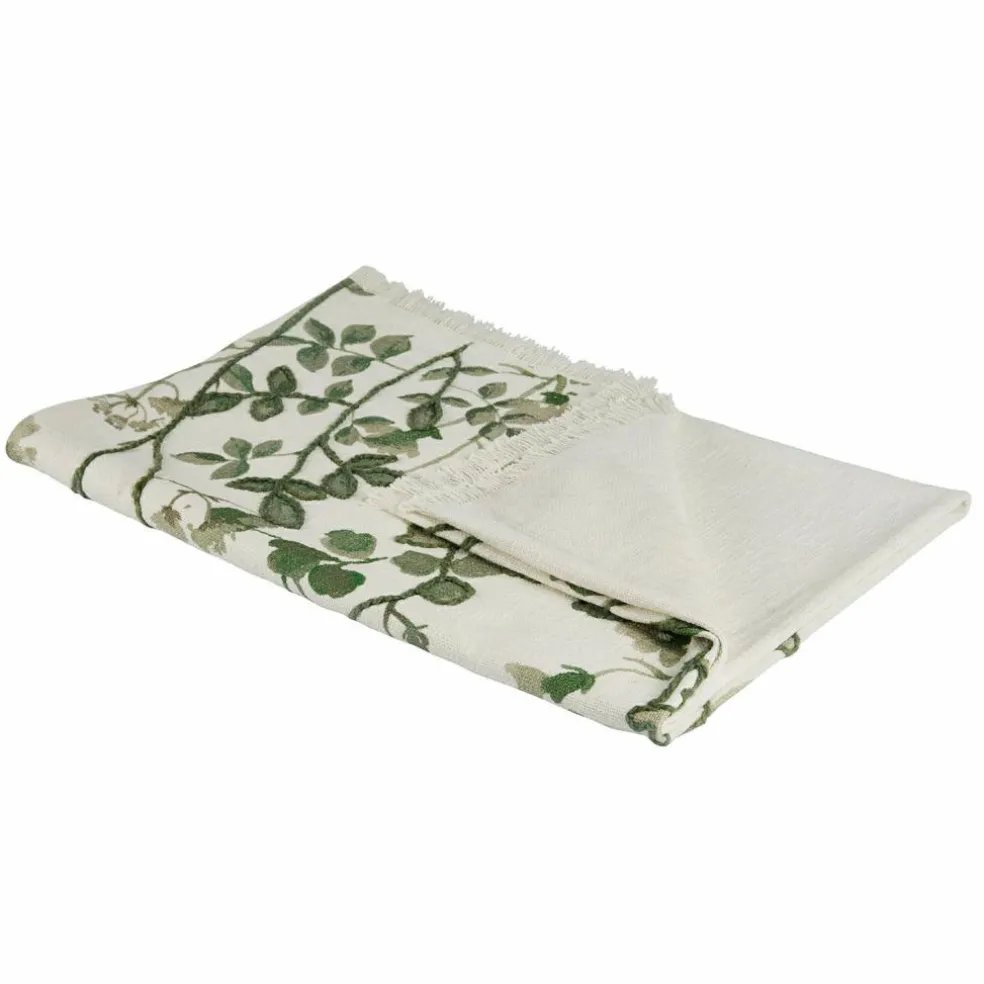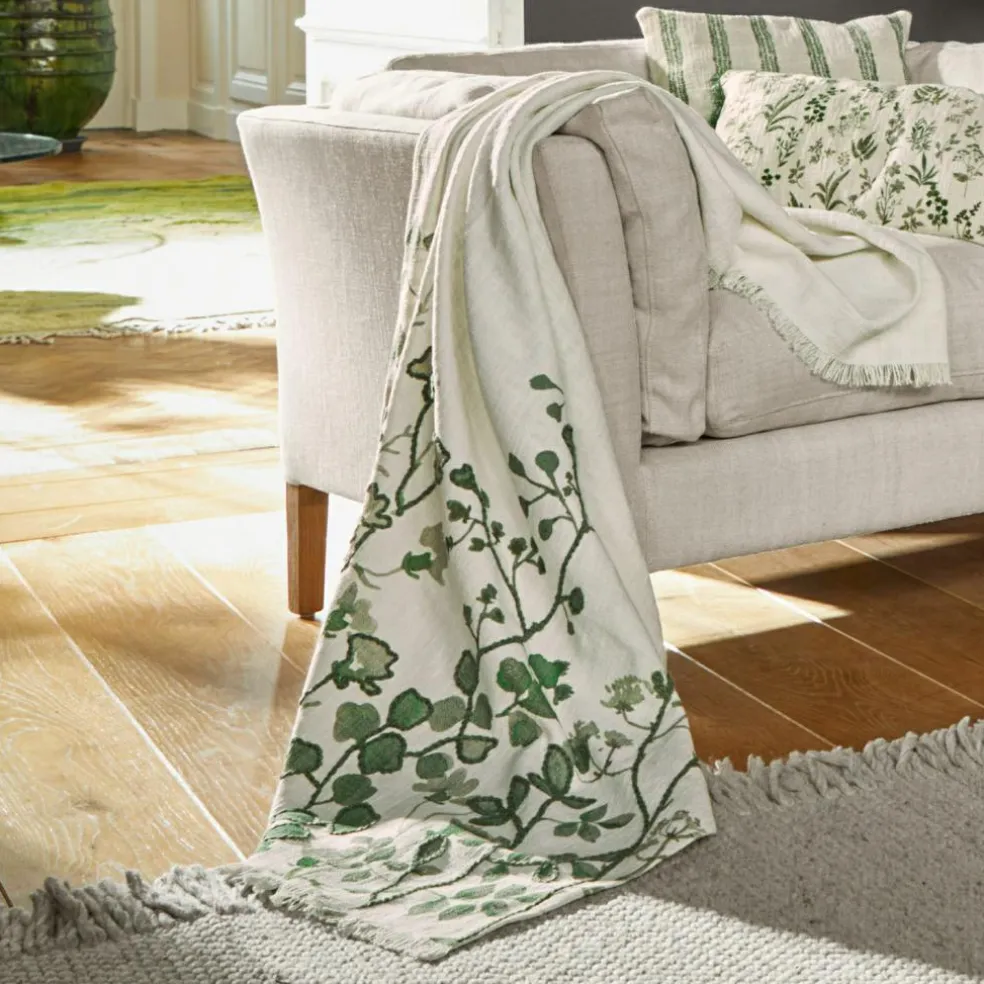 Comme une douce brise qui traverse un jardin verdoyant, : tel est l’effet produit par ce plaid au style botanique. Les branches et les fines feuilles se déploient dans différents tons de vert sur un fond clair et confèrent au tissu une légèreté presque poétique. La combinaison de l’impression et de la broderie apporte un raffinement particulier : les petites branches individuelles sont travaillées en relief et apportent ainsi profondeur et structure. Le plaid n’est pas seulement un accessoire textile, mais un hommage délicat à la nature. Parfait pour tous ceux qui souhaitent enrichir leur intérieur d’un naturel paisible.