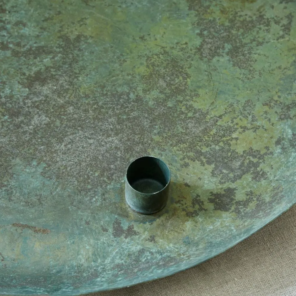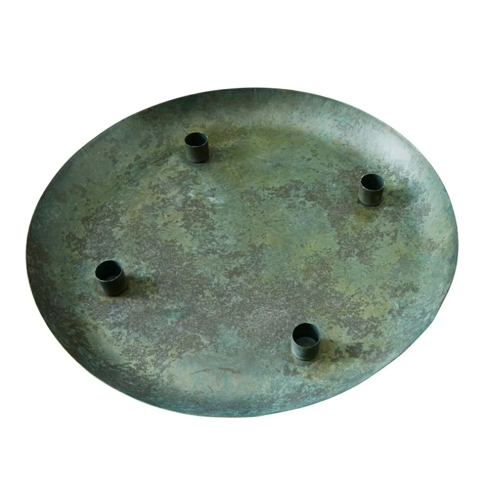 Cet extraordinaire plateau à bougies en fer est un véritable créateur d’ambiance : sa forme circulaire généreuse, avec ses quatre supports discrets invite à la créativité en matière de décoration. Que ce soit de la mousse, des boules, des fleurs séchées ou des bâtons de cannelle , il y a suffisamment de place au centre pour vos décos personnelles. La surface confère au plateau une profondeur terreuse avec sa patine finement chatoyante aux nuances doré-vert qui s’harmonise merveilleusement avec les matériaux naturels. Une véritable pièce maîtresse pour la table qui fera son effet tout au long de l’année , comme couronne de l’Avent moderne ou source de lumière d’ambiance pour chaque occasion.