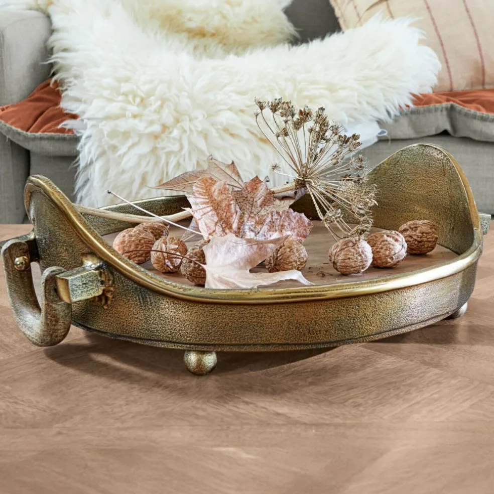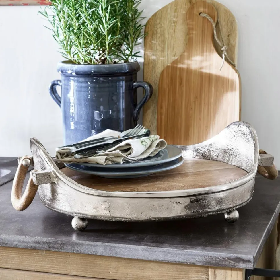 Un élégant accessoire en aluminium et en bois de manguier. Un modèle d’une grande élégance, en aluminium nickelé et en beau bois de manguier. Pour les petits-déjeuners du week-end, pour le café ou le thé ou encore pour les dîners chics : vos petites douceurs seront servies à table avec beaucoup de style. Vous pouvez même les présenter directement sur le plateau. Le look d’une grande élégance rehaussera chaque table. Le plateau est facile à porter grâce aux poignées placées sur les côtés. Il sera également une base parfaite pour toutes les compositions décoratives. Vous le garnirez par exemple de photophores, de bougies odorantes et de fleurs fraîches et créerez ainsi un bel îlot décoratif au centre de votre table.