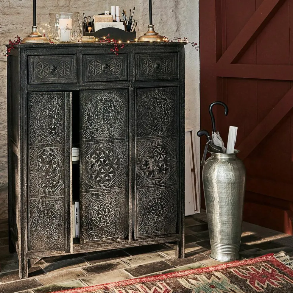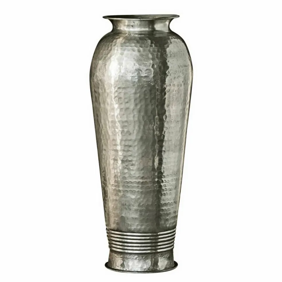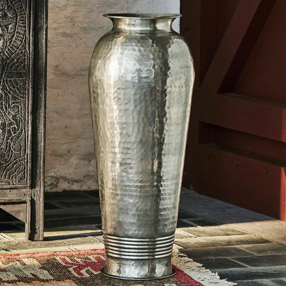 L’entrée d’une maison en dit long sur ses habitants. Et si vos invités peuvent ranger leur parapluie dans un porte-parapluie comme celui-ci lors d’une journée pluvieuse, il est évident qu’une élégance pleine de caractère avec une touche individuelle à sa place chez vous. Ce porte-parapluies a été fabriqué à la main à partir d’aluminium robuste, et sa surface a été décorée selon la technique traditionnelle du martelage, ce qui lui donne un aspect merveilleusement animé grâce aux superbes effets de lumière chatoyants. Enfin, la finition argenté vieilli confère à cet accessoire l’aura d’une antiquité précieuse. Mais le porte-parapluies ne se contente pas seulement d’accueillir les parapluies, il peut également servir d’élégant vase de sol pour d’imposantes compositions de fleurs séchées, d’herbes de la pampa très nature, de coton séché ou encore d’eucalyptus ou de branches de houx.