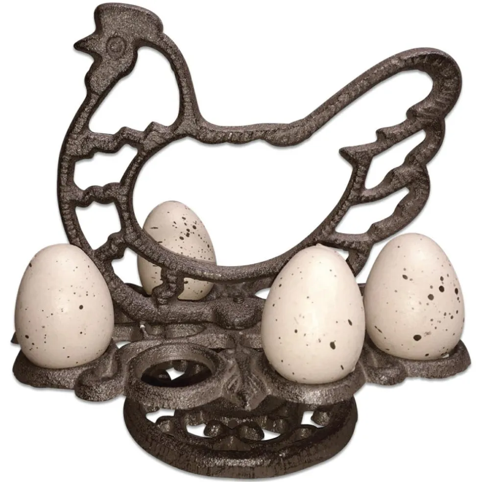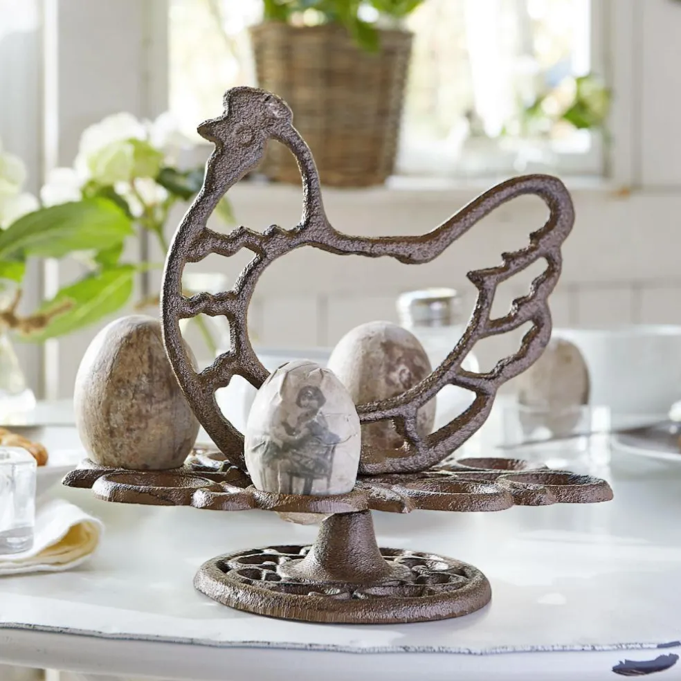 Ce présentoir à œufs en fonte est l’accessoire ultime pour votre table au petit-déjeuner ou au brunch de Pâques. Ce modèle, avec sa poule qui veille joyeusement sur ses œufs, saura apporter un charme printanier à votre table. Les œufs de Pâques colorés disposeront d’un présentoir de choix ! La poule pourra ensuite attendre sa prochaine mission, bien installée sur votre buffet. Vous avez l’impression de retrouver la cuisine chaleureuse de votre grand-mère ? Le charme vintage de cet accessoire de table décoratif assure une ambiance agréable et saura faire ressurgir de beaux souvenirs d’enfance. Ce présentoir en fonte s’associe particulièrement bien avec les styles maison de campagne ou cottage chic.