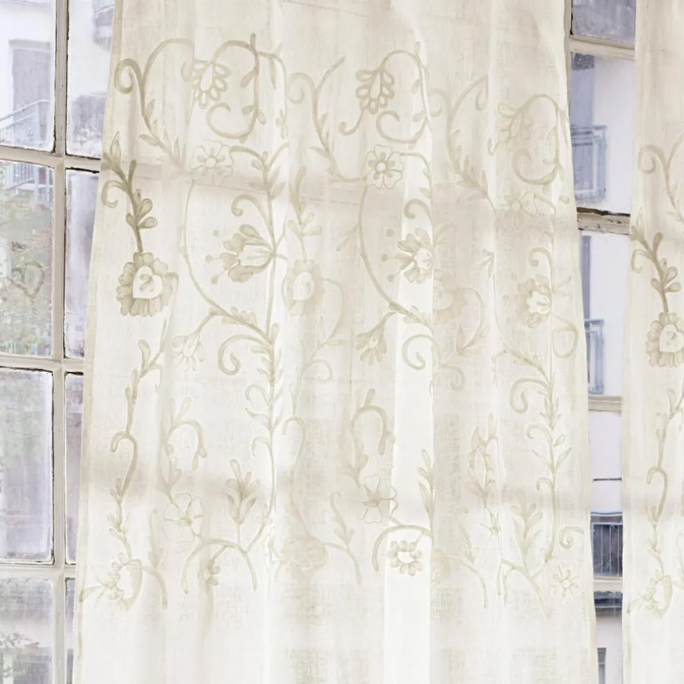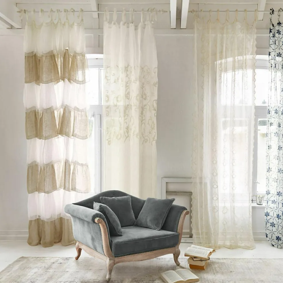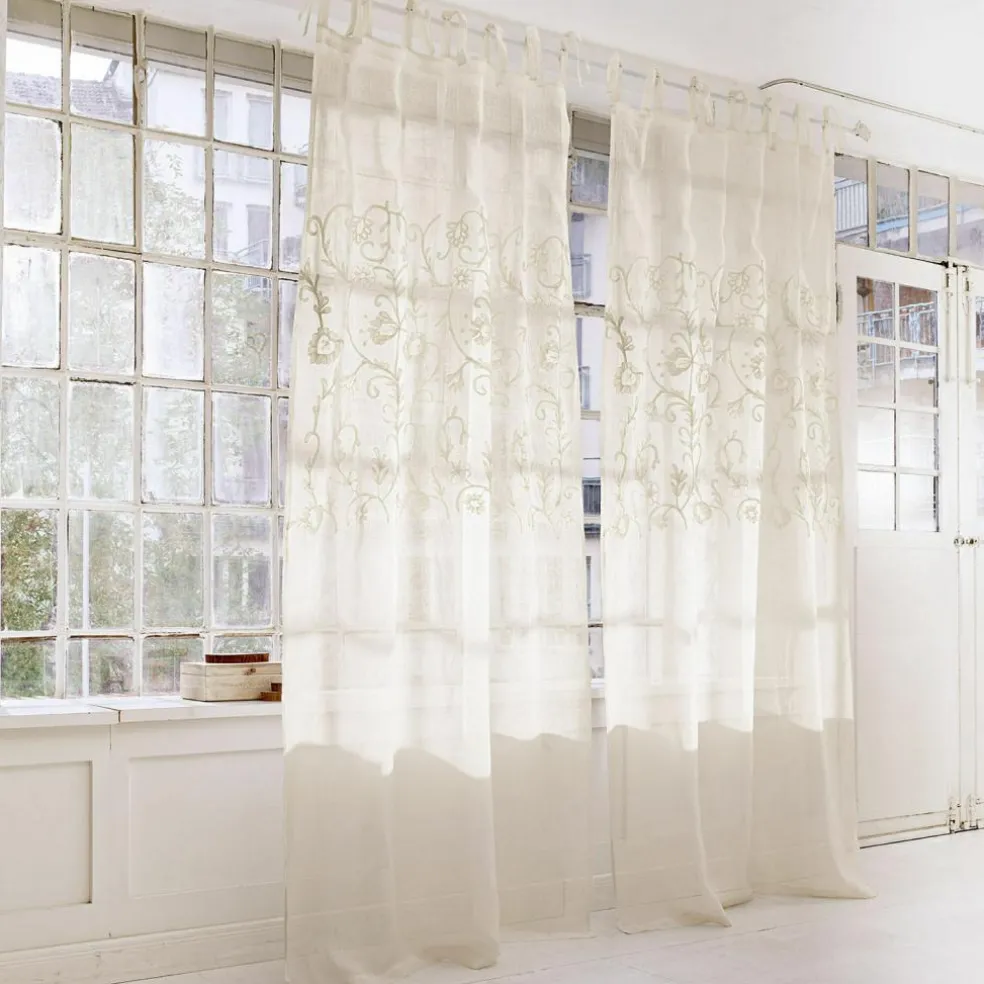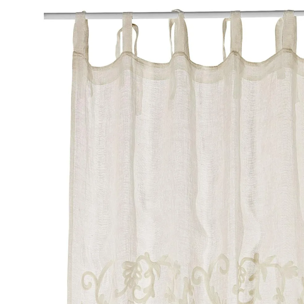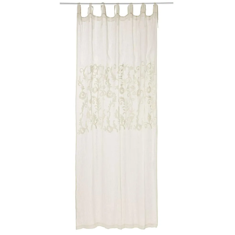 Ravissant voilage en pur lin aux broderies enchanteresses. Il dégage une ambiance très romantique et s’accorde merveilleusement bien aux intérieurs au style shabby chic. Tissu en lin haut de gamme. Grâce à son adorable broderie, ce rideau clair et frais décorera toutes vos fenêtres. Le motif vrille renforce l’aspect délicat et romantique. Les grandes dimensions permettent d’accrocher ce rideau même aux fenêtres hautes des bâtiments anciens. Les rubans à nouer décoratifs facilitent la suspension à une tringle à rideaux. Le lin haut de gamme rafraîchira naturellement et agréablement les journées chaudes. Il protégera des regards vos moments de détente. Cet accessoire léger est lavable à 30 ° et sera ainsi toujours aussi vaporeux. Ce rideau est parfait pour tous les styles — shabby chic, cottage, romantique — et ajoutera une charmante touche vintage à votre intérieur. Oubliez le stress du monde moderne et reposez-vous dans un intérieur à l’ambiance harmonieuse. Vous l’avez bien mérité.