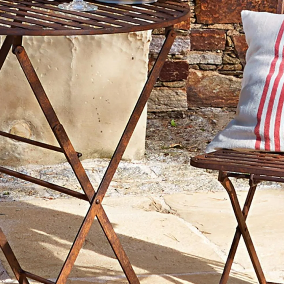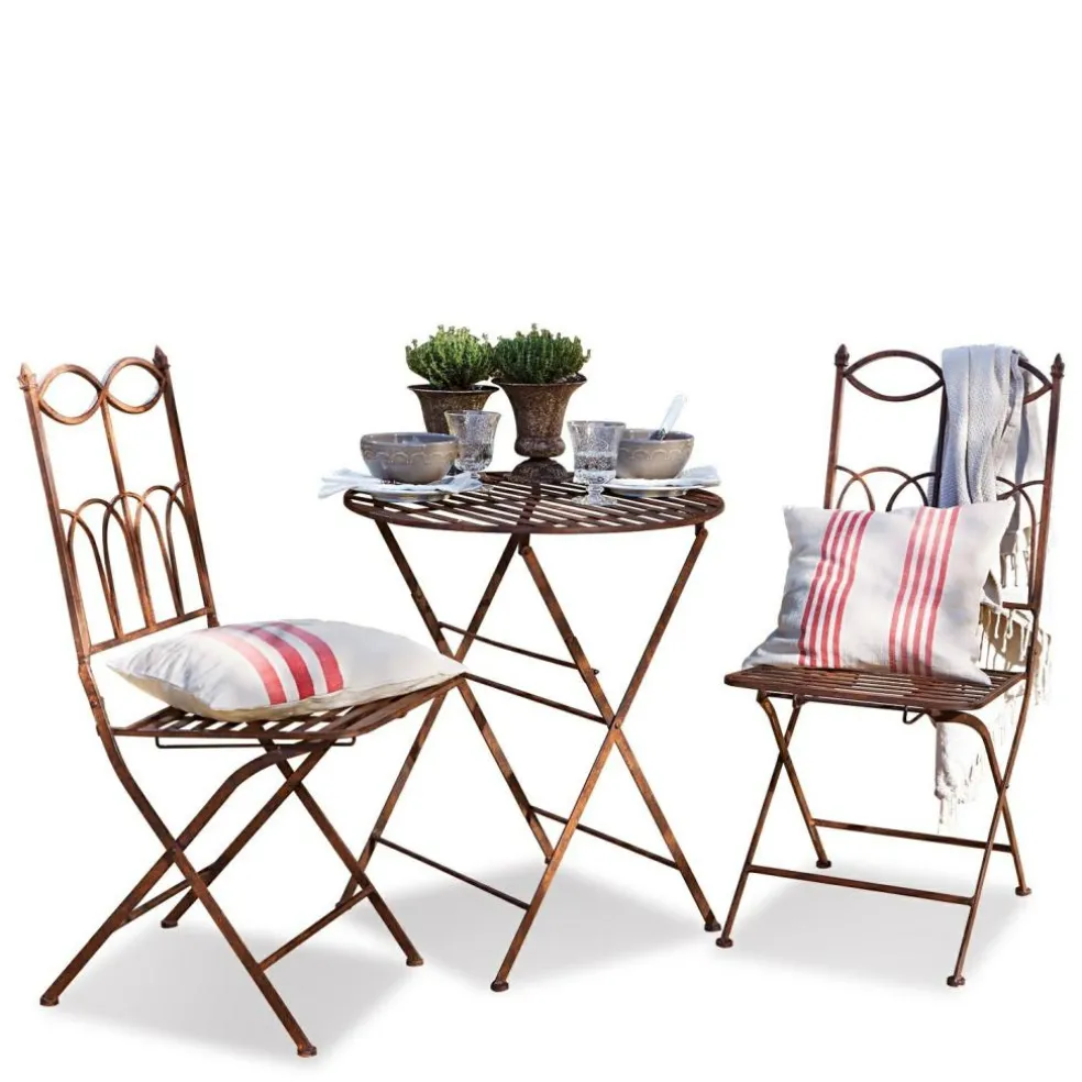 Cet ensemble au style rétro est composé d’une table et de deux chaises. Pratique, il se replie et se range facilement. Cet ensemble léger au charme nostalgique en fer forgé à la finition haut de gamme est d’une rare élégance. On aime aussi sa finition brun patiné et sa fonction pliable pratique. Cette association réussie d’un design fonctionnel et d’un petit air Art nouveau ne peut que vous séduire. La table et les chaises sont à l’épreuve des intempéries et se replient rapidement, offrant ainsi un rangement peu encombrant. Les deux chaises aux délicates lignes galbées et la table seront toujours prêtes à être installées là où vous en avez besoin. Placées dans l’entrée, elles accueilleront vos visiteurs ou vous offriront une place agréable pour vous chausser. Dans le séjour, elles agrémenteront le décor d’une note de légèreté méditerranéenne. Vous pouvez aussi les disposer dans le jardin ou sur le balcon, au beau milieu d’odorantes roses en fleur, pour y créer un coin romantique digne du 19ème siècle. Cet ensemble est en outre très facile à entretenir. Un chiffon doux imbibé d’un peu d’eau chaude additionnée d’un produit nettoyant doux suffira amplement.