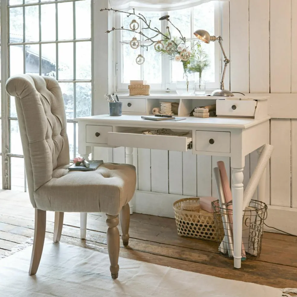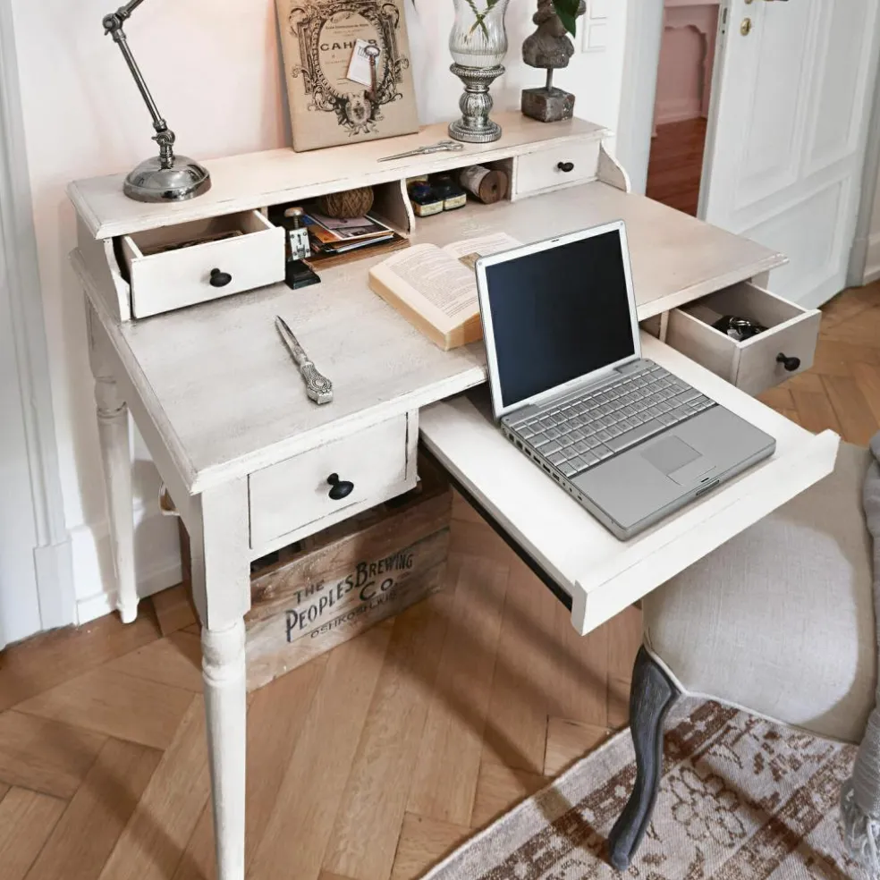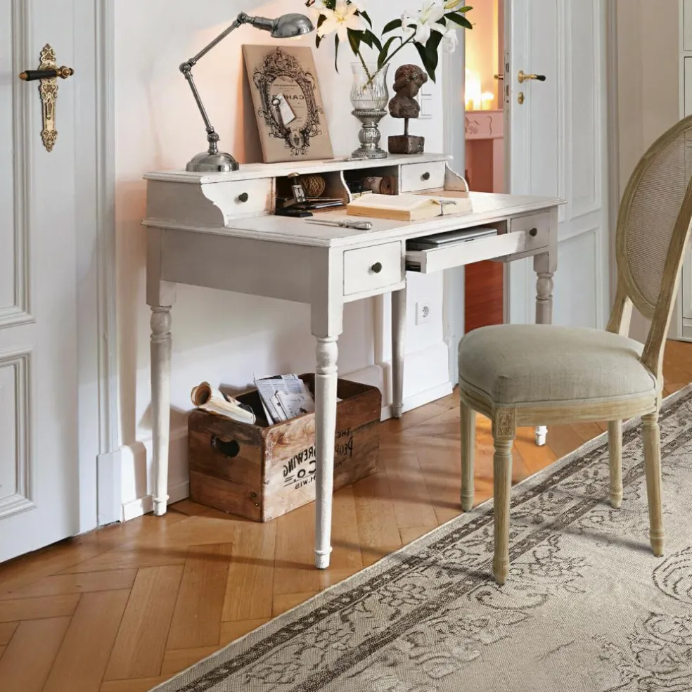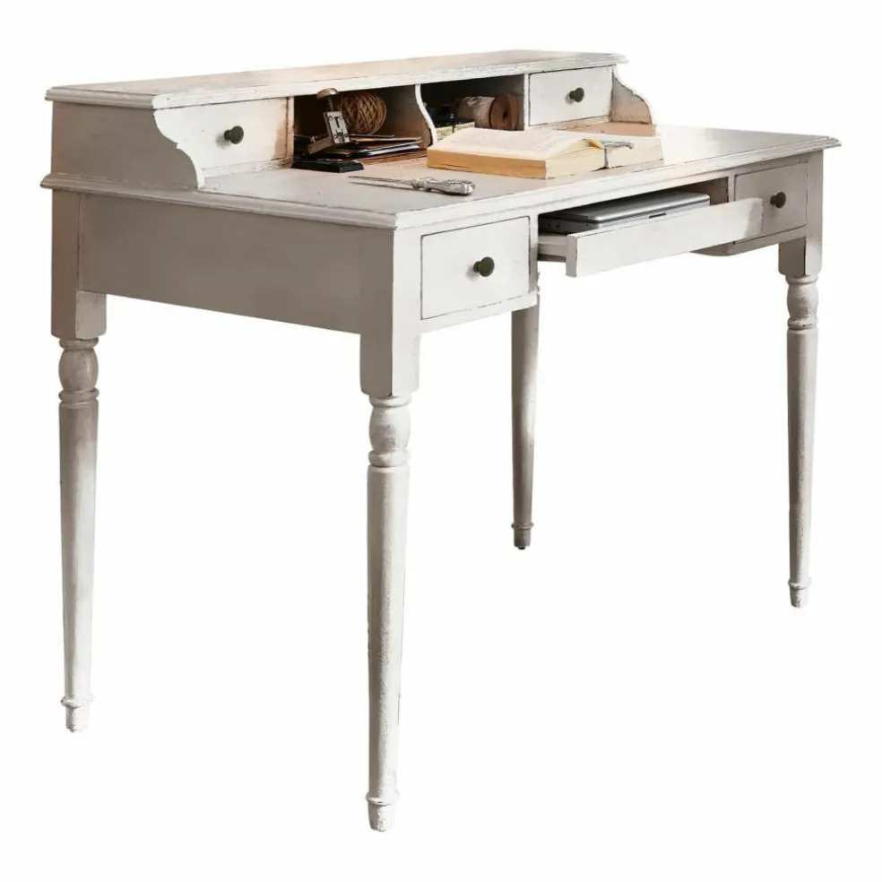 Ce secrétaire, réalisé en bois naturel, est revêtu d’un beau fini vieilli. Chaque centimètre de sa surface reflète son caractère original. Mais l’esthétique ne doit naturellement pas faire oublier l’aspect fonctionnel. Outre la surface de travail, vous disposez également de quatre tiroirs et de deux tablettes de rangement. Tout en haut se trouve une étroite tablette, et une planche en fibres de bois est dissimulée sous le plateau. Ce dernier est très facile à rentrer et à sortir – pour y poser un clavier d’ordinateur, par exemple.