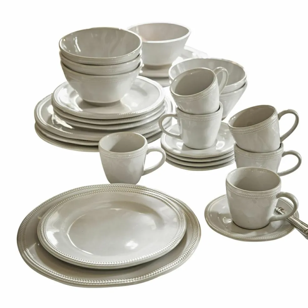 Si la vaisselle pouvait raconter des histoires, ce service de 30 pièces évoquerait des moments de fête, des tables de petit-déjeuner dressées avec amour et de longs brunchs dominicaux. Chaque pièce est fabriquée en grès émaillé résistant, maniable et avec une surface agréablement douce. Les bords en forme de feuillage rappellent les motifs floraux des broderies d’antan et confèrent à l’ensemble sa signature toute particulière. Que ce soit pour la famille ou pour des invités, avec ce service comprenant six assiettes, six assiettes à dessert, six bols, six tasses et leurs soucoupes assorties, tout est prêt pour des repas riches en ambiance, qui en plus d’être bons, seront aussi beaux!