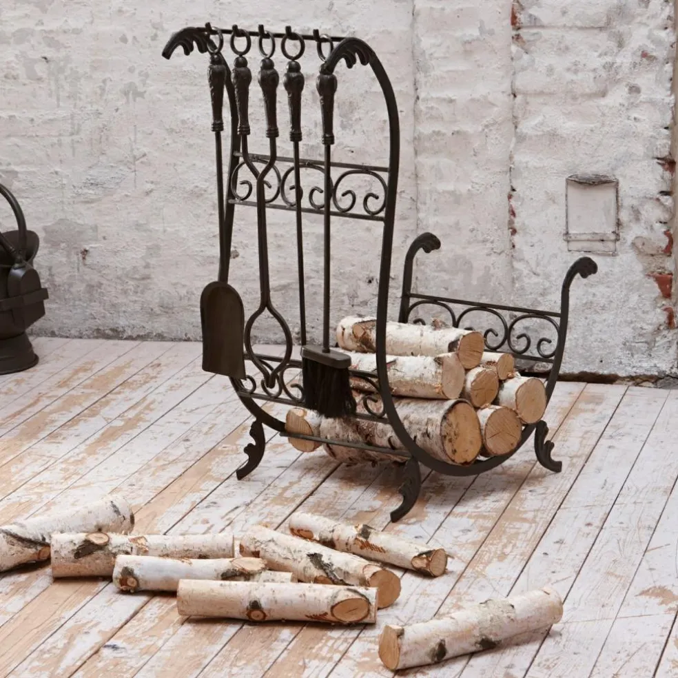 Le serviteur de cheminée vous est livré sous la forme d’un lot de 5 pièces comprenant un tisonnier, une pince à braises, une pelle et un balai, suspendues à un support fait main servant également de porte-bûches. Ainsi, vous avez toujours à portée de main tous les ustensiles nécessaires pour faire du feu rapidement et en toute sécurité. Les ustensiles sont suspendus à des crochets joliment travaillés qui soulignent les ornements décoratifs en fer forgé du support.