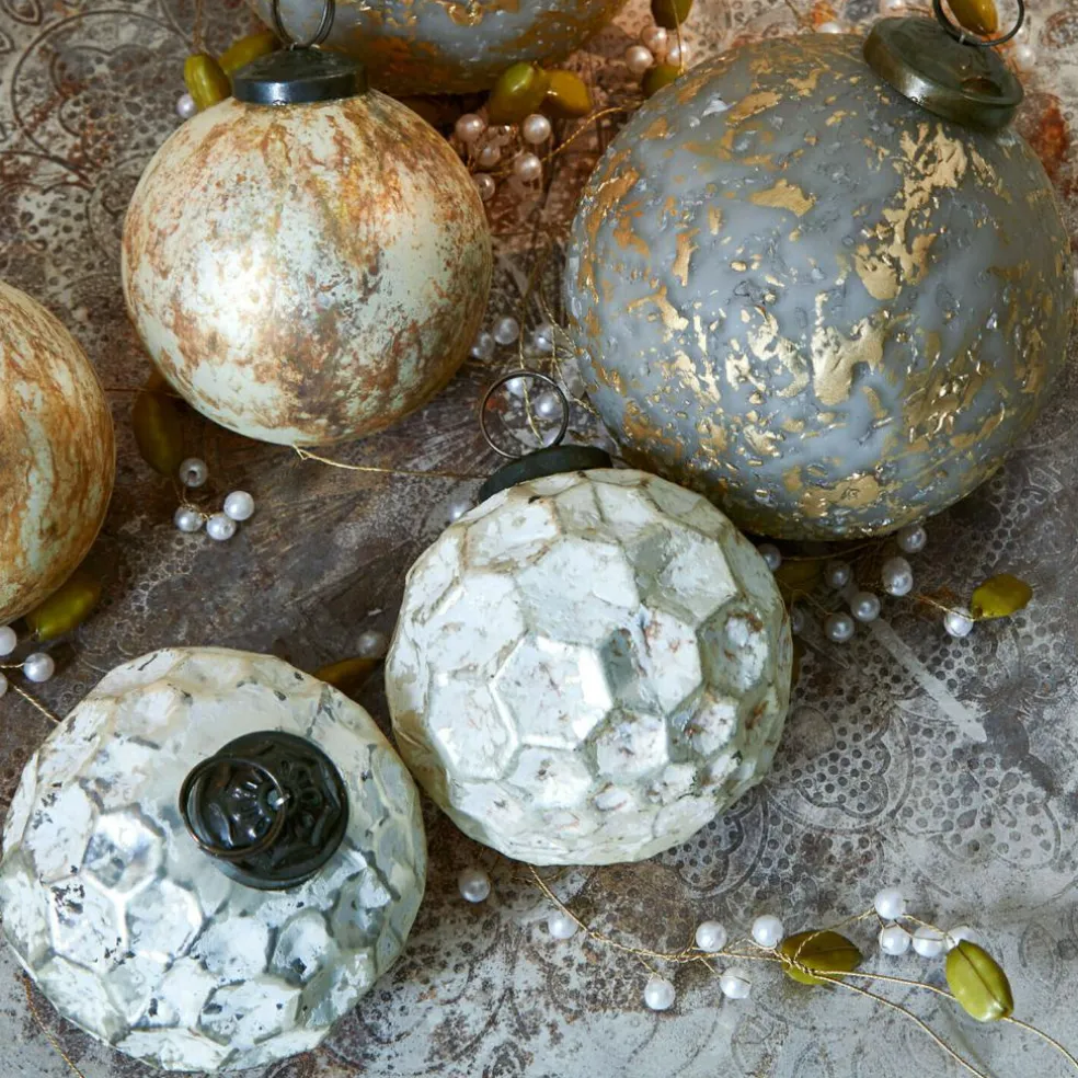 Six boules aux motifs différents témoignent d’un jeu de textures et de la lumière : deux sont recouvertes de veines dorées sur un gris fumé, deux rayonnent d’un look vintage crème délicatement moucheté, et deux présentent un aspect en relief façon pierre avec une surface pleine de caractère. Malgré leur diversité, les boules donnent l’impression d’avoir été créées d’un seul tenant , elles s’accordent harmonieusement les unes aux autres, avec une touche de noblesse, presque digne d’un musée. Elles apportent de la profondeur aux branches de sapin vertes, brillent discrètement à la lumière des bougies et s’intègrent facilement dans les intérieurs de Noël modernes et classiques. Un ensemble pour les amateurs de détails fins et d’élégance subtile.