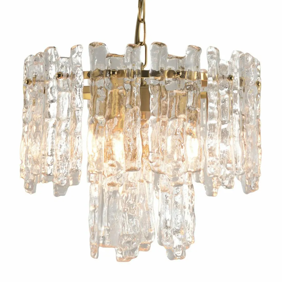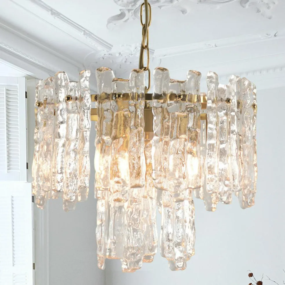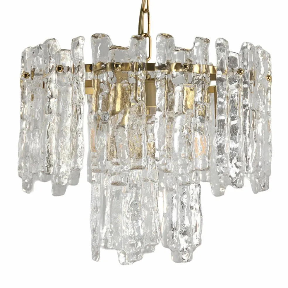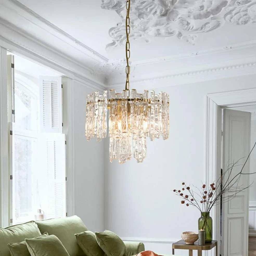 Cette suspension fait penser à un matin d’hiver glacial, lorsque les premiers rayons du soleil rencontrent des glaçons scintillants : les prismes de verre artistiquement formés ressemblent à des gouttes gelées qui réfractent la lumière de manière magique et la transforment en un scintillement vivant. Cette composition lumineuse est supportée par une structure métallique délicate rehaussée d’une finition doré vieilli et qui dégage une touche de glamour vintage. La combinaison harmonieuse de transparence et de reflets chauds fait de cette suspension un magnifique bijou pour les intérieurs stylés. Que ce soit dans un intérieur de style classique ou moderne, il apporte en tout lieu une touche étincelante qui attire le regard et réchauffe le cœur.