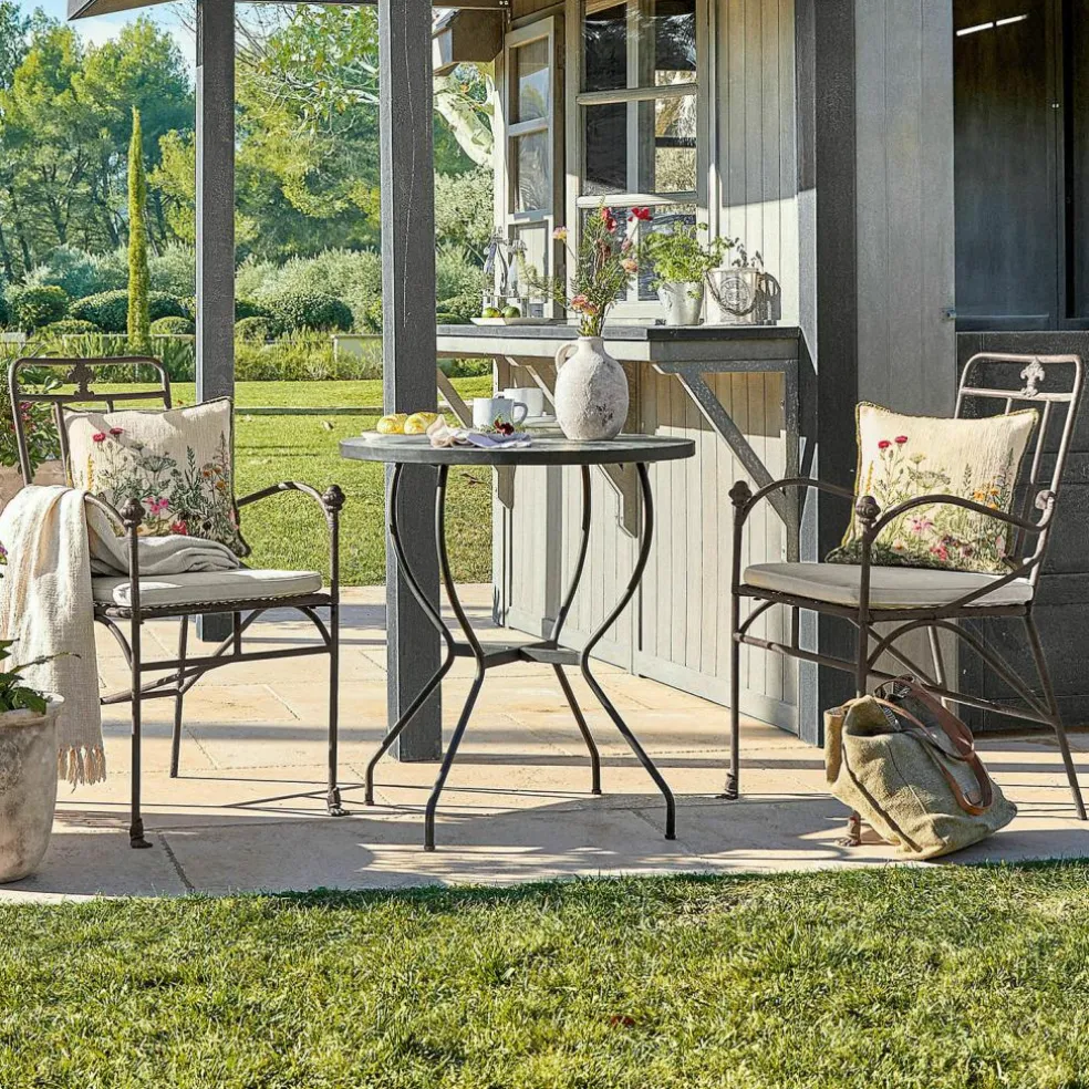 L’art de la pose de la mosaïque est aussi décrit comme une peinture avec des pierres. Avec cette table, l’artiste a donné vie au motif classique de soleil qui orne traditionnellement les tables rondes dans le Bassin Méditerranéen, tandis que les délicates nuances de gris des pierres rappellent les murs usés en pierre naturelle des jardins méridionaux. Comme chaque mosaïque est posée à la main, aucune ne ressemble exactement à une autre, ce qui fait de chaque table une pièce unique. Le plateau décoratif est soutenu par un piètement solide en métal doté d’une finition imperméable. Le plateau aussi résiste au soleil et à la pluie. Vous pourrez donc vous installer à cette table aussi souvent que vous le voulez, pour vous reposer après le jardinage, pour faire une petite pause-café ou pour profiter de la fin de la journée. Dans le jardin, sur le balcon ou dans la cour intérieure d’une maison de ville, cette table sera toujours un partenaire de style pour vos moments de détente.