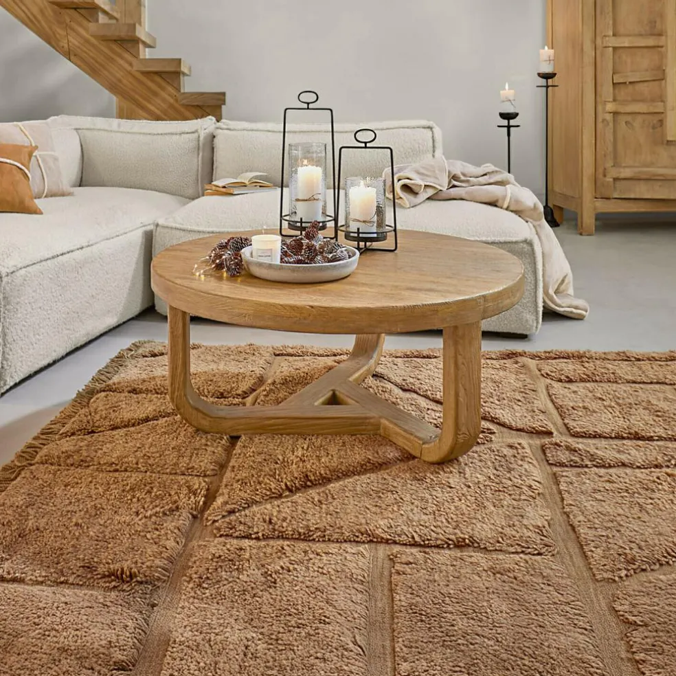 Elle semble faite d’un seul bloc : puissante, naturelle, et pourtant étonnamment harmonieuse, cette table basse en orme massif revalorisé apporte une sensation d’équilibre dans le salon grâce à sa forme ronde. Le plateau de table présente une image de bois finement nuancée avec des veines authentiques au passé bien rempli. Le piètement à l’aspect architectural (un triangle stylisé qui confère à la table non seulement sa stabilité, mais aussi son caractère sculptural) attire tout particulièrement l’attention. La couleur naturelle et la structure subtile de la surface en bois lui permettent de s’intégrer aussi bien dans un environnement moderne que rustique. Une table qui offre pas seulement une esthétique, mais également une présence : un havre de paix au fort rayonnement.