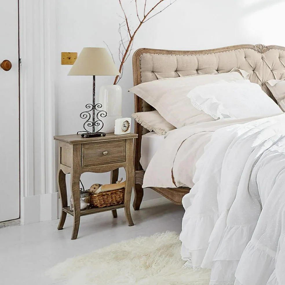 Cette table de chevet très chic est le résultat d’un travail artisanal soigné, elle séduit particulièrement par ses pieds tournés à la main, avec leurs lignes à la fois courbes et discrètes. Visuellement, un autre de ses atouts est le veinage de son bois de manguier facile à entretenir, dans la lignée de l’art de vivre le plus classique. Mais outre son esthétique raffinée, ce bijou du mobilier possède des aspects très pratiques: livres et lunettes viennent trouver leur place sur sa surface, mais aussi les bijoux auxquels vous tenez le plus ou des articles de décoration chics comme de beaux vases, des chandeliers ou des lampes nostalgiques, ainsi que d’autres ustensiles dans le tiroir. Une vraie table de chevet confortable et agréable à regarder pour se glisser dans le lit ou en sortir tous les soirs et tous les matins.