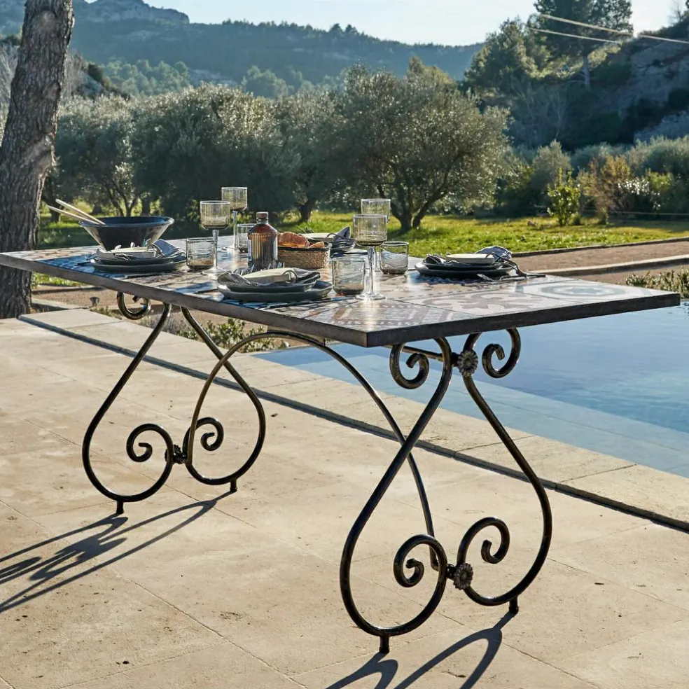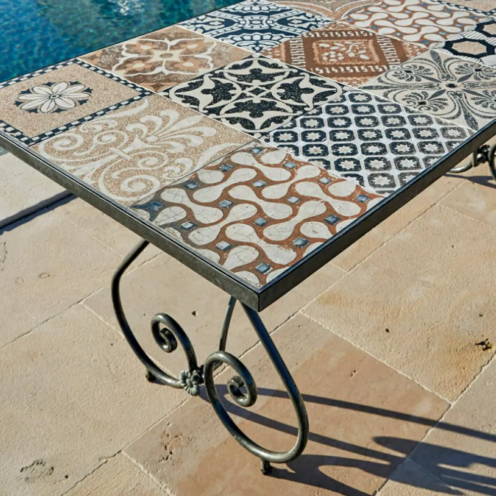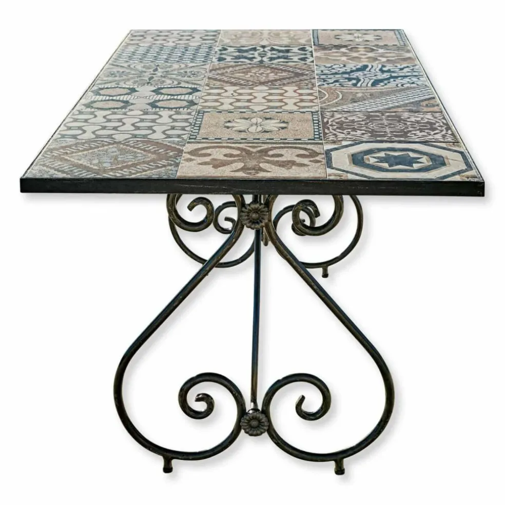 Grands carreaux en mosaïque aux motifs sophistiqués. Un design luxueux, composé d’une structure en fer forgée à la main et revêtue à la poudre, et d’un beau plateau recouvert de carreaux en mosaïque. Modèle d’inspiration méditerranéenne, résistant aux intempéries. Une magnifique table aux dimensions généreuses autour de laquelle vous passerez de merveilleux moments à l’extérieur. Le plateau recouvert de superbes carreaux à motifs repose sur une structure en fer joliment galbée. Un meuble au charme nonchalant d’un été méditerranéen. Une merveilleuse pièce haut de gamme, que vous admirerez pendant de nombreuses années.