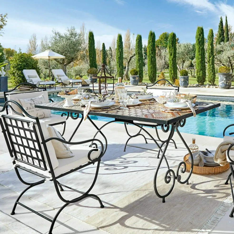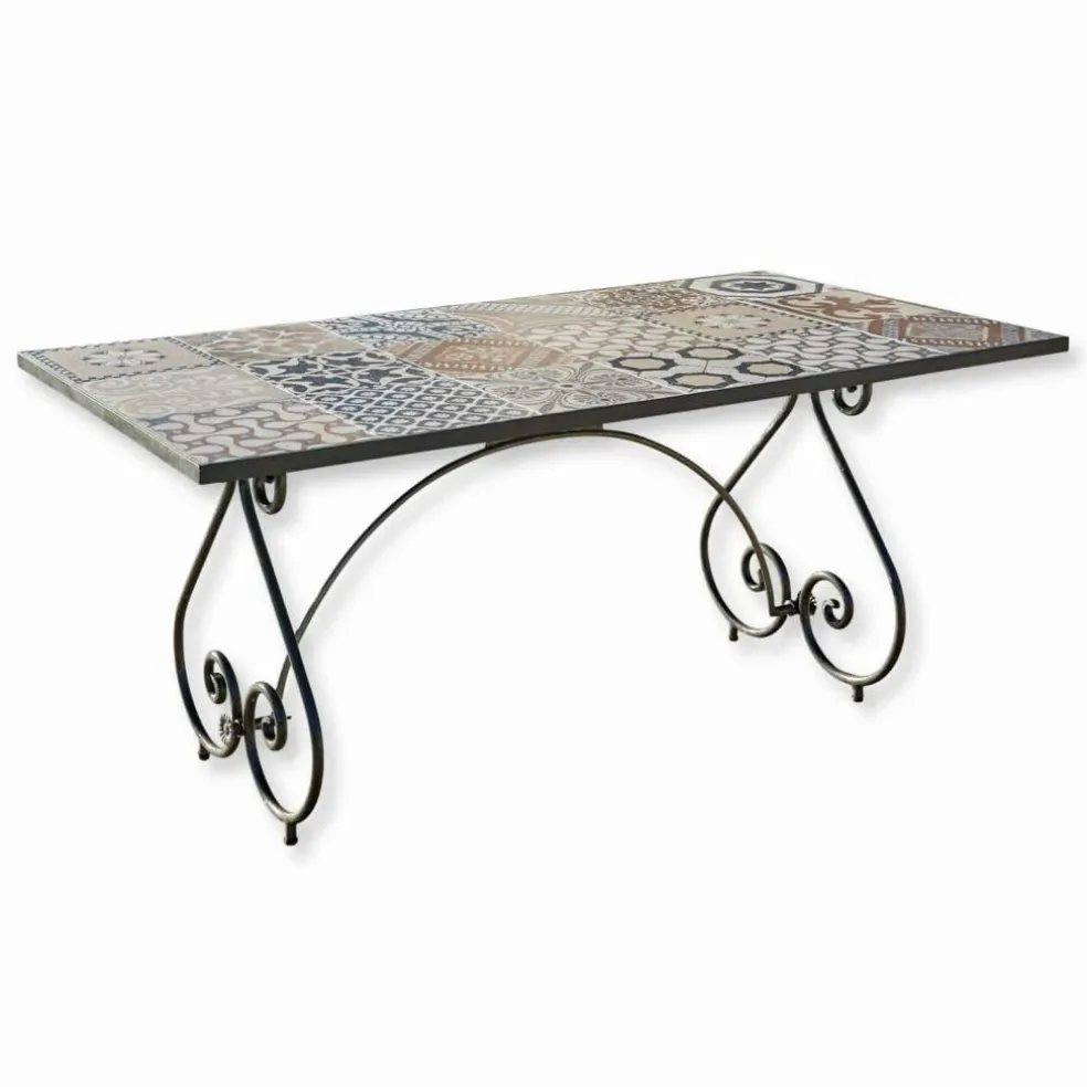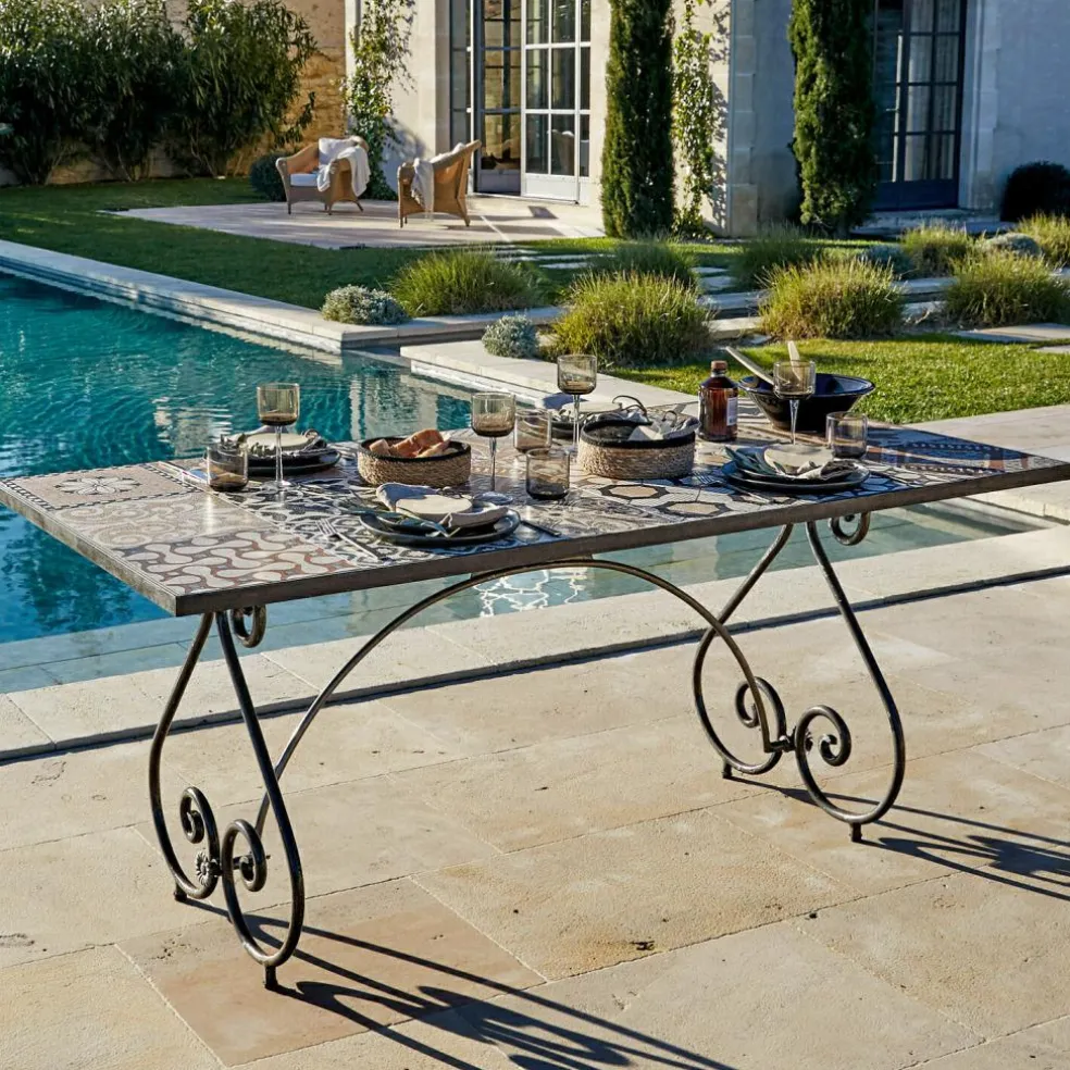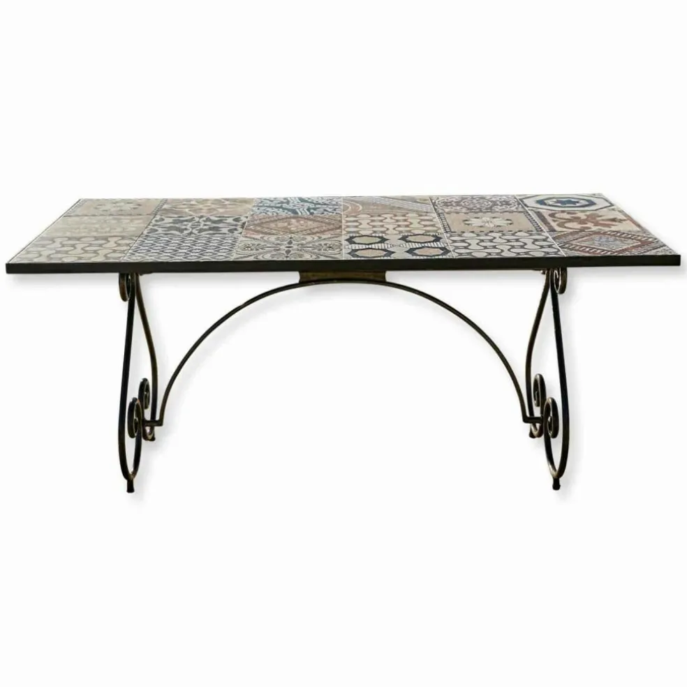 Grands carreaux en mosaïque aux motifs sophistiqués. Un design luxueux, composé d’une structure en fer forgée à la main et revêtue à la poudre, et d’un beau plateau recouvert de carreaux en mosaïque. Modèle d’inspiration méditerranéenne, résistant aux intempéries. Une magnifique table aux dimensions généreuses autour de laquelle vous passerez de merveilleux moments à l’extérieur. Le plateau recouvert de superbes carreaux à motifs repose sur une structure en fer joliment galbée. Un meuble au charme nonchalant d’un été méditerranéen. Une merveilleuse pièce haut de gamme, que vous admirerez pendant de nombreuses années.