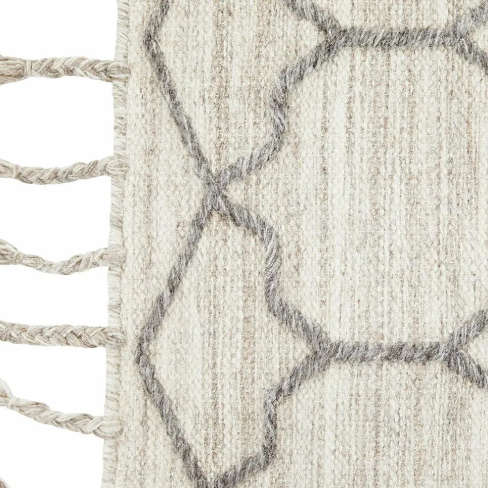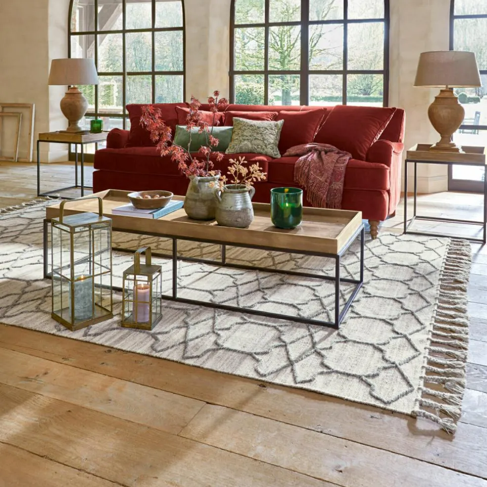Un tapis n’est pas forcément la pièce qu’on achète en premier lorsqu’on aménage dans un nouvel endroit ou que l’on redécore son intérieur, mais il reste un accessoire précieux dont on ne peut que difficilement se passer. Et ce pour des raisons pratiques autant qu’esthétiques. En effet, un tapis souligne avec brio le style d’un intérieur sans trop s’imposer visuellement au premier plan. C’est du moins le cas de ce tapis au coloris naturel et clair avec un motif tissé discret, complété avec goût par des franges tressées. Ce dernier a également été tissé soigneusement à la main dans de la pure laine, matière qui n’a pas d’égal dès lors qu’on décide d’allier aspect naturel et chaleur. Doux et accueillant, ce tapis est l’accessoire idéal pour un intérieur accueillant et cerise sur le gâteau : il amortit les pas et régule la température du sol.