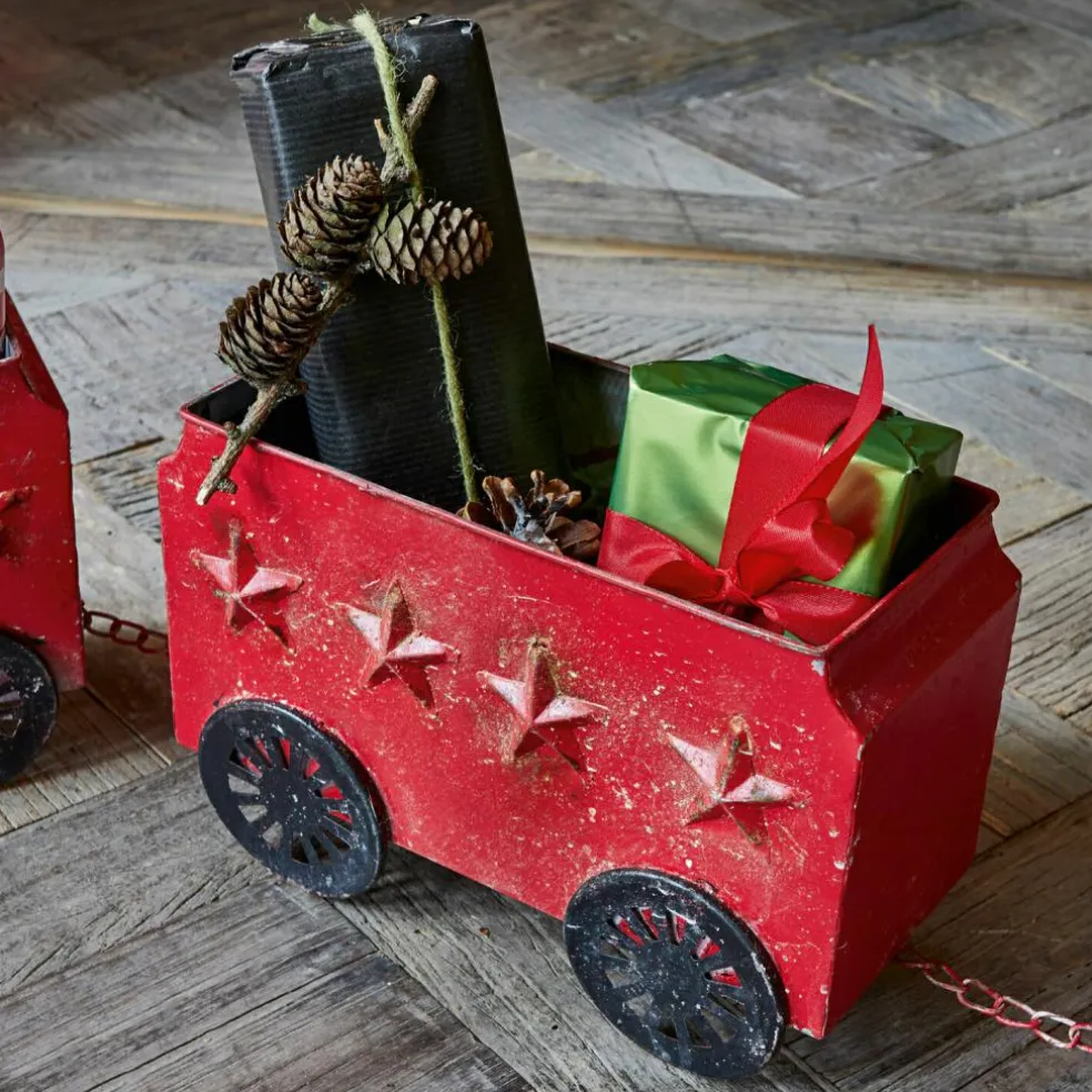 Locomotive en étain et ses 2 wagons. Aspect coloré pour une déco originale. Style vintage authentique comme autrefois. Ce lot de décorations semble tout droit sorti d’un musée de jouets. En réalité, il s’agit simplement d’une jolie réplique, fidèle à l’original. Malgré son inspiration vintage, ce train s’inscrit dans l’ère du temps et s’intègre parfaitement avec tous les styles d’intérieur. Son aspect coloré est agrémenté de jolis détails et s’accorde facilement avec d’autres objets déco. Que diriez-vous de remplir les wagons de perles ou de plantes colorées ? Ou pourquoi pas d’une guirlande LED ? La locomotive et les wagons sont reliés par une chaîne, que vous pourrez facilement retirer pour utiliser les trois éléments ensemble ou séparément.
