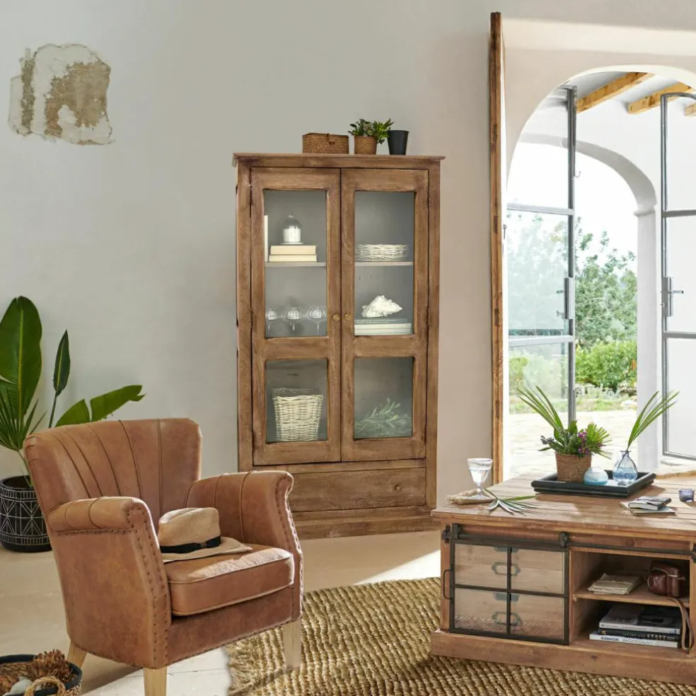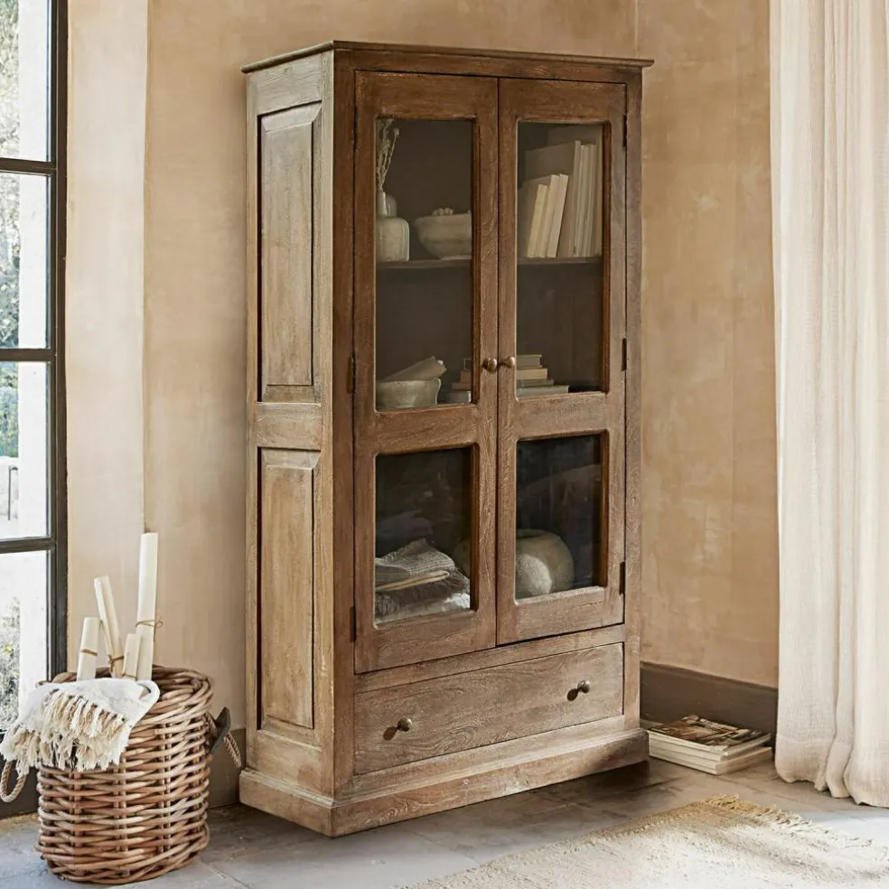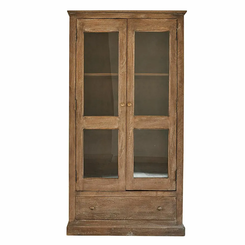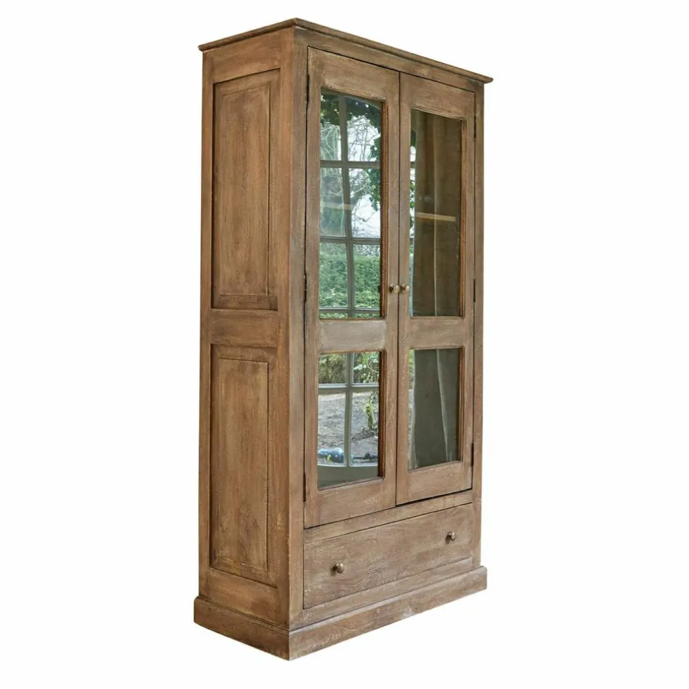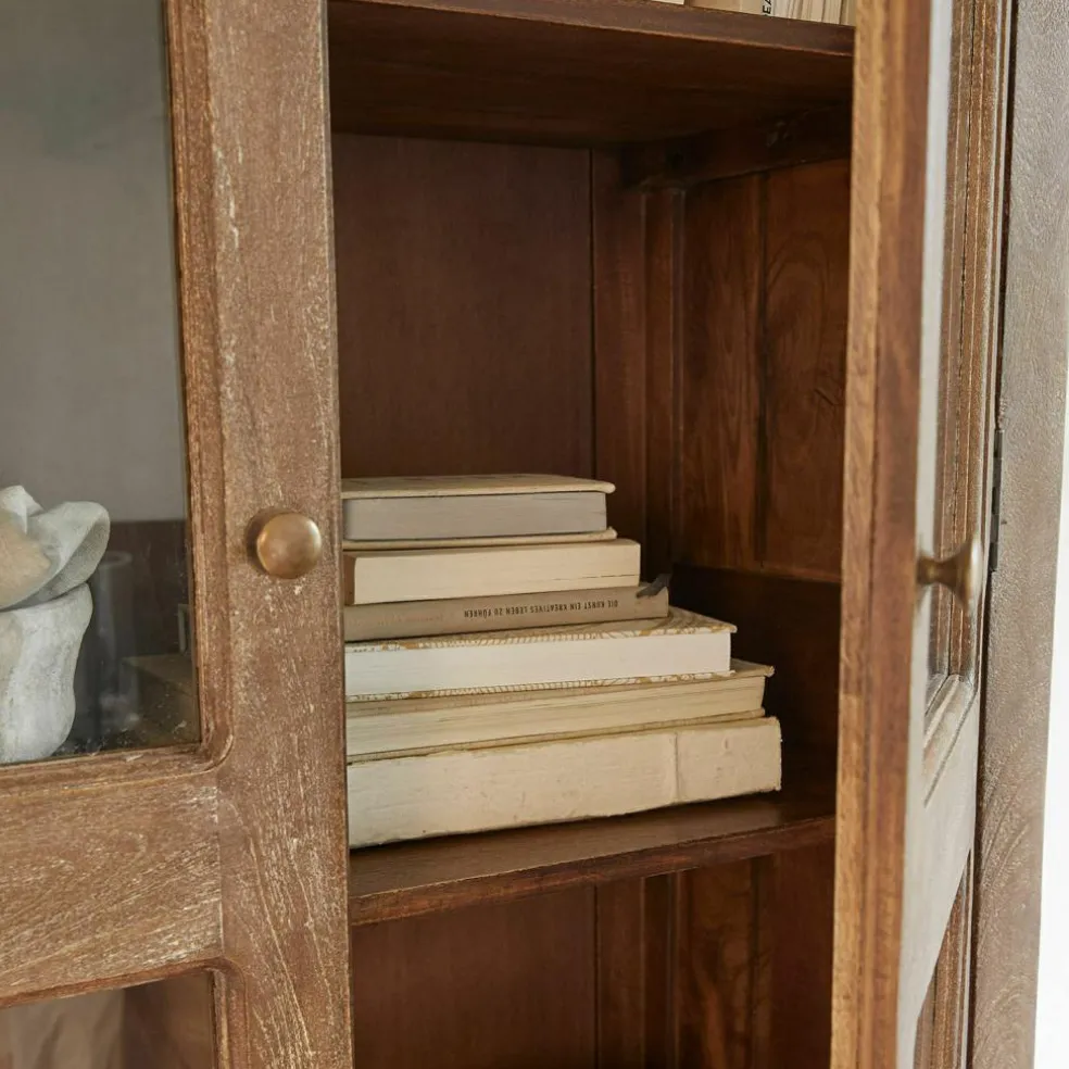 Laissez-vous envoûter par l’élégance intemporelle de ce vaisselier en bois de manguier qui se distingue par sa finition blanchie et par sa touche aussi rustique que raffinée. Le veinage du bois soigneusement travaillé est une preuve de la qualité de sa matière et de la minutie dont a fait preuve son concepteur. Les solides poignées en laiton sont agréables à prendre en main et les portes vitrées invitent à présenter ses plus beaux objets triés sur le volet. Utilisé comme bibliothèque, vitrine pour présenter vos plus beaux objets ou simplement comme élégant meuble de rangement : ce vaisselier est une superbe pièce dans chaque intérieur et combine fonctionnalité et touche de luxe.