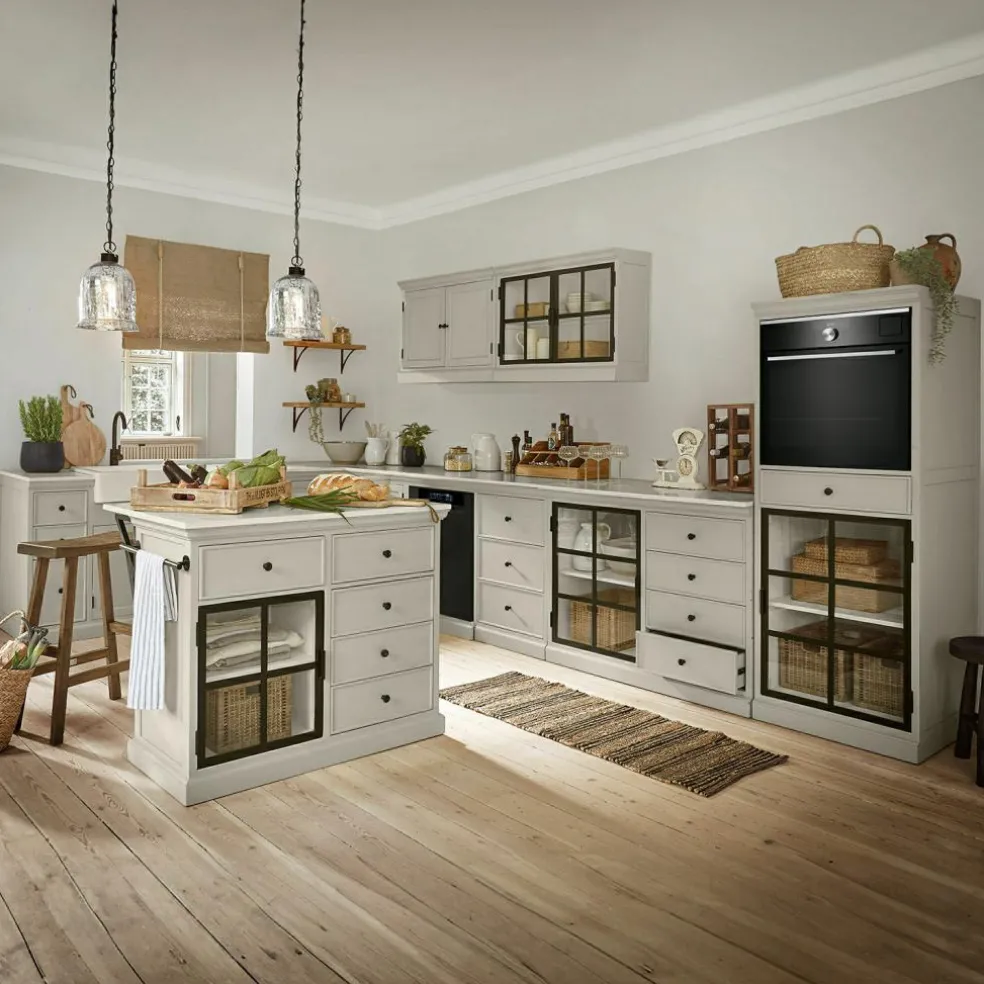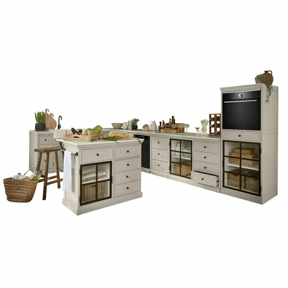 Découvrez la symbiose parfaite entre un style industriel robuste et le charme d’une maison de campagne avec ces éléments de cuisine hors du commun. L’ensemble en bois de manguier laqué rayonne d’une élégance chaleureuse et naturelle tout en résistant au temps et à l’usure comme seule une cuisine haut de gamme le peut. Pratique et solide, le plan de travail en pierre naturelle haut de gamme confère à la cuisine un air luxueux. L’ensemble comprend tout ce que l’on attend d’une cuisine moderne : un meuble haut et spacieux avec emplacement pour four (24080), un meuble d’angle bien pensé (24059), un meuble sous évier élégant avec un évier en céramique (24081), un meuble pour lave-vaisselle (24082) et un rangement polyvalent vitré dans un style industriel. Cet ensemble d’éléments de cuisine modulable s’adapte parfaitement à vos besoins et à votre pièce. Un incontournable pour la maison alliant à la perfection style et fonctionnalité.