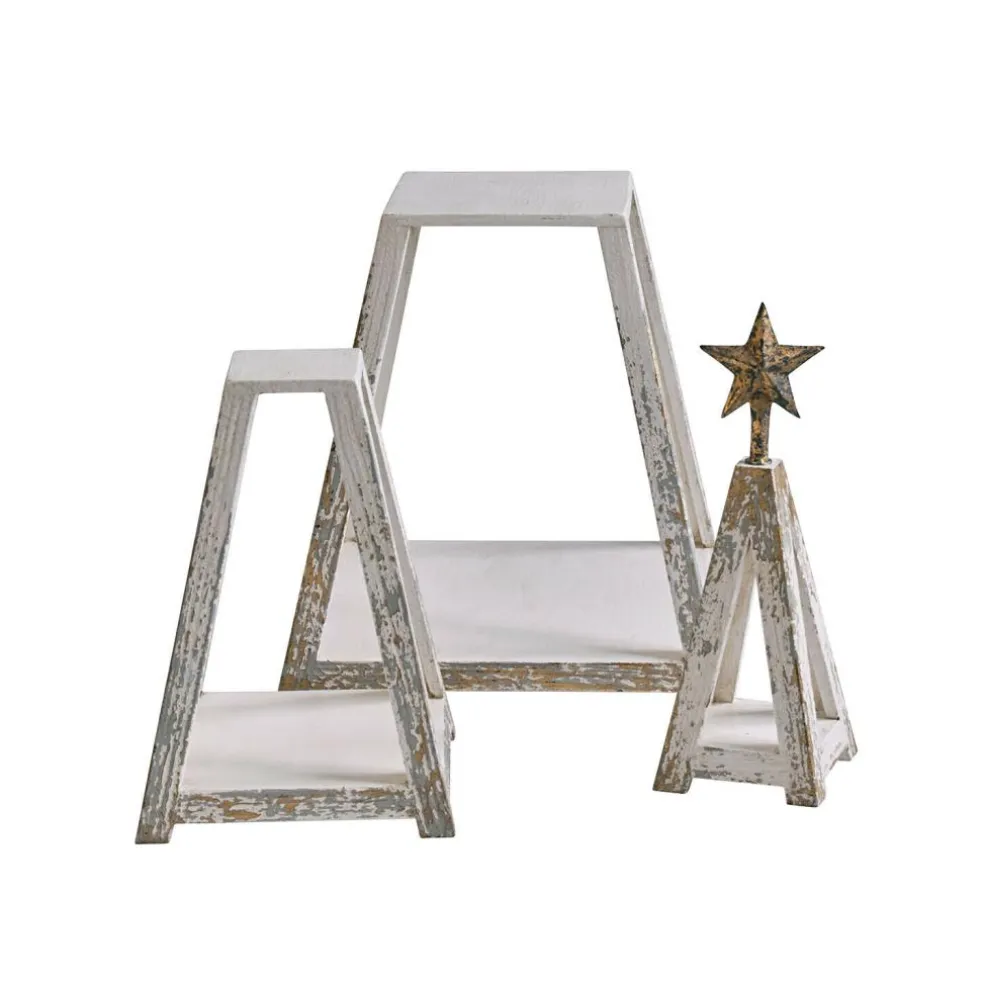 Il fait penser à un sapin de Noël stylisé, même s’il est bien plus que cela : cette pièce décorative marquante associe du bois de sapin rustique à une finition blanc vieilli qui rappelle les meubles de campagne patinés par le temps. Les trois étagères ouvertes vous invitent à créer vos propres petites scènes décoratives, peut-être avec des boules de Noël en verre, des bougies ou une touche de nature. Chaque étage agit comme une petite scène pour vos objets préférés. Les bords charmants et polis racontent le style d’antan, tandis que l’étoile en fer dorée au sommet ajoute une touche festive. Un sapin décoratif pour tous ceux qui recherchent l’originalité, que ce soit pour la période de Noël ou comme décoration permanente avec une touche créative.