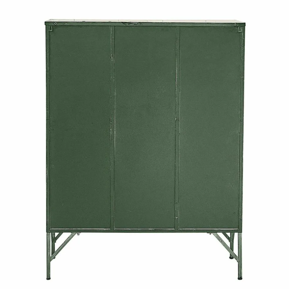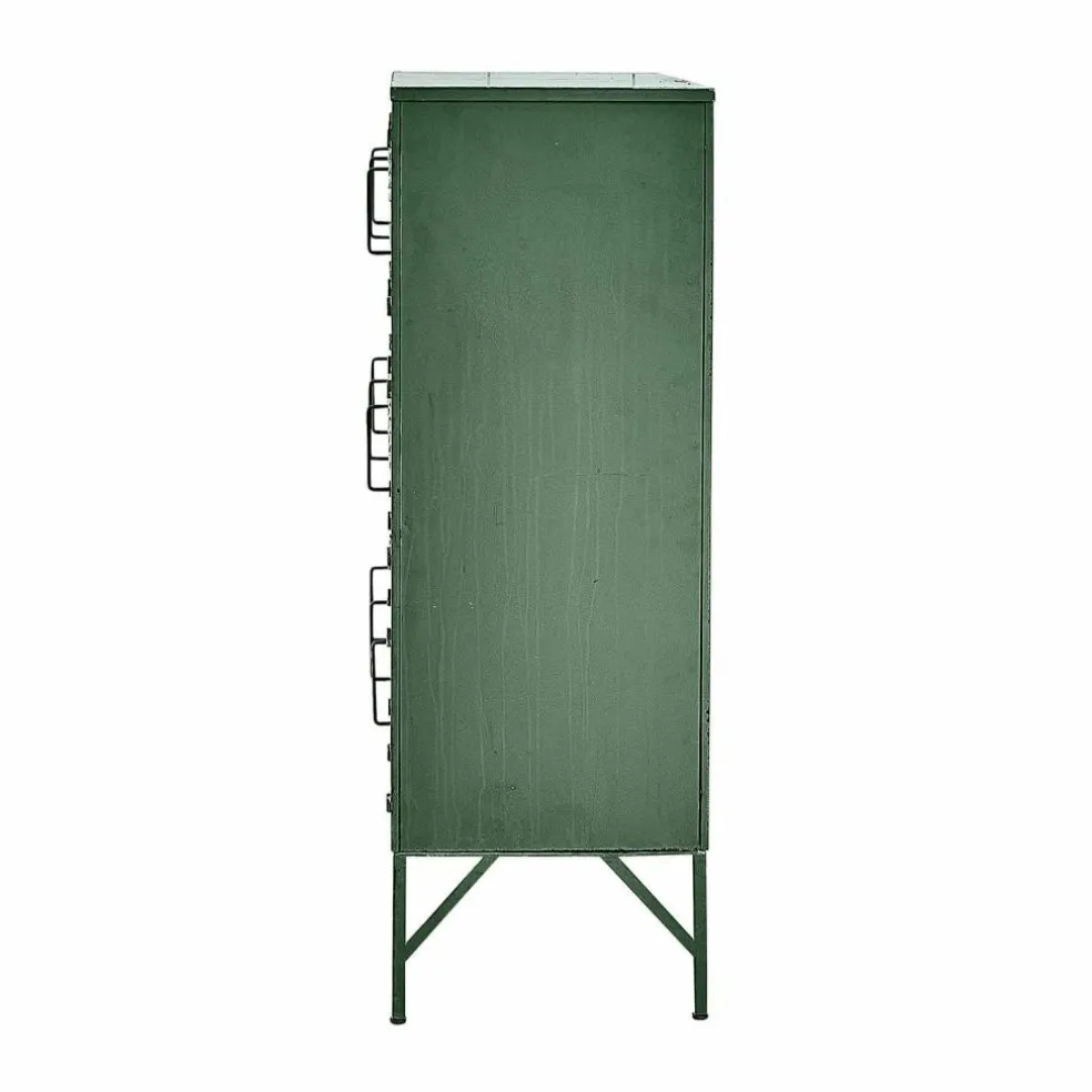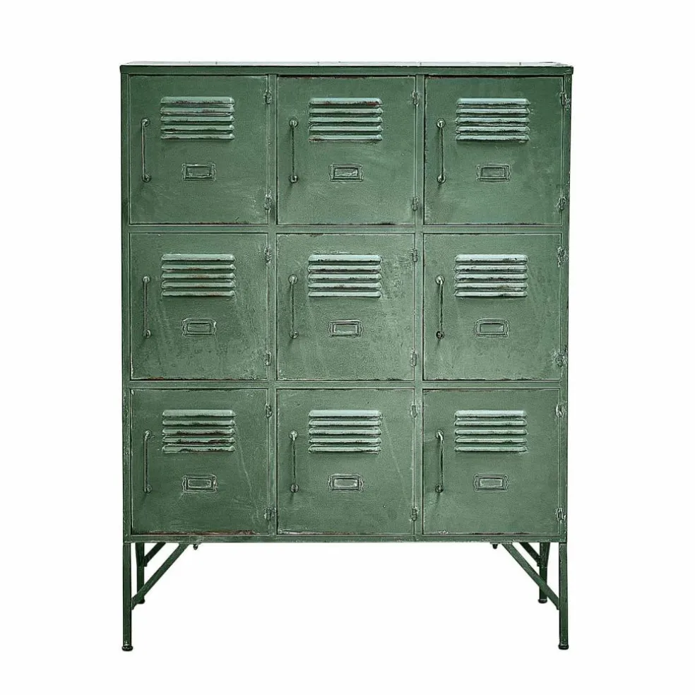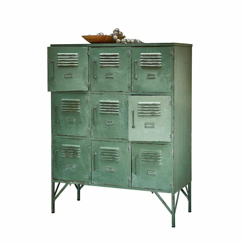 Cette armoire est une véritable déclaration d’amour au style industriel. Confectionnée en fer, elle se distingue par sa finition vert vieilli et son aspect rouille authentique qui renforce son caractère vintage. Chaque compartiment est équipé de fentes d’aération et de poignées, ce qui confère à la commode une touche nostalgique qui rappelle les anciens casiers. Il y a également de la place sur chaque porte pour des cartes à insérer (non incluses). Sa fonctionnalité polyvalente et son design remarquable en font une pièce incontournable pour les espaces où l’individualité et le style sont de mise. Que ce soit dans le salon, l’entrée ou le bureau, ce meuble attire l’attention tout en offrant des possibilités de rangement pratiques.