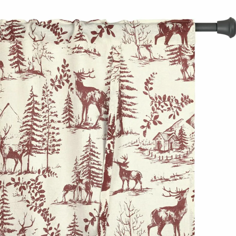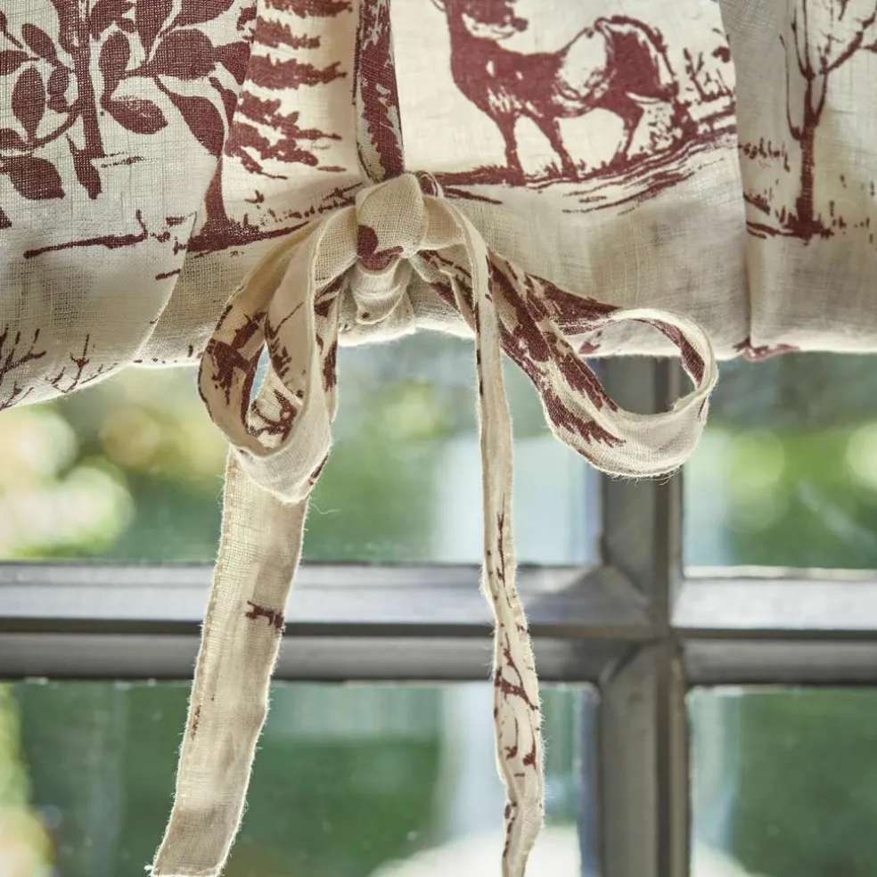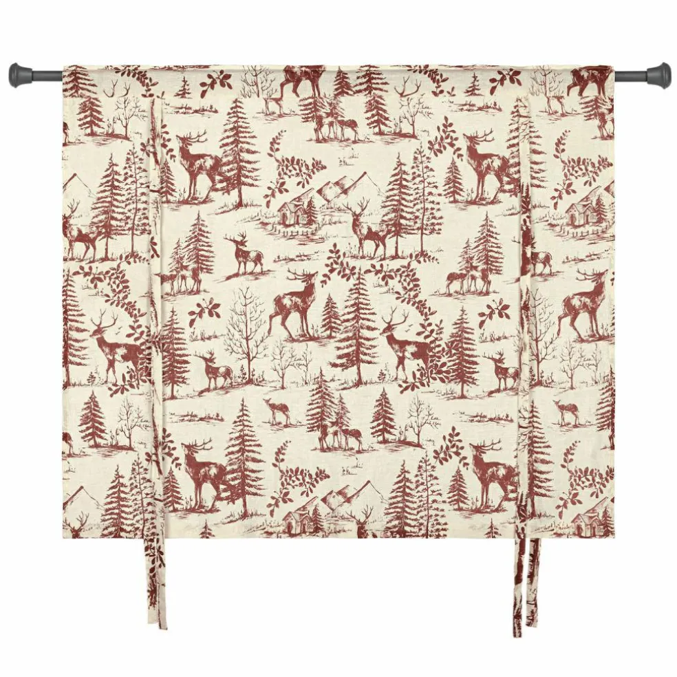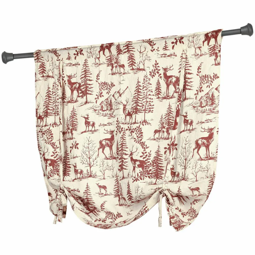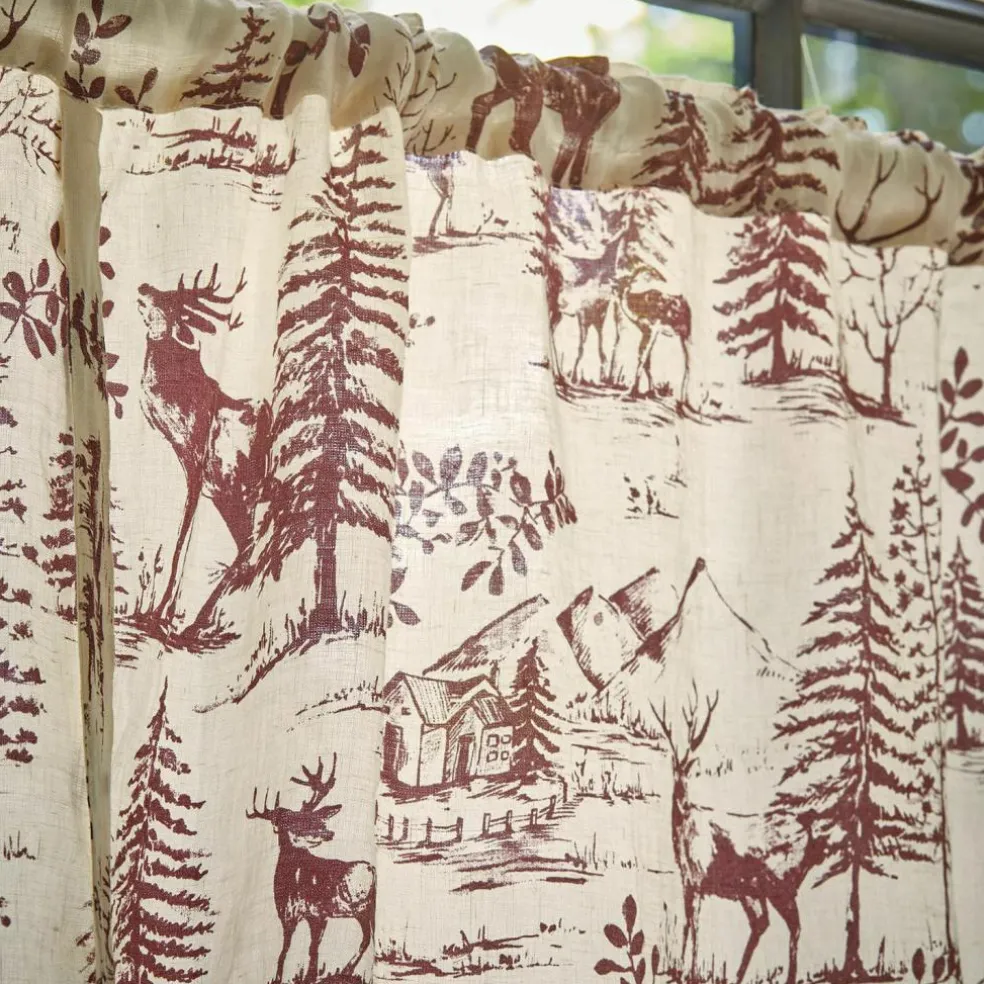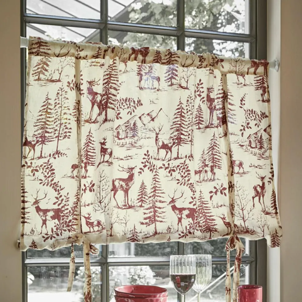 Il suffit d’un regard pour se sentir transporté dans un chalet de montagne enneigé. Ce brise-bise en lin naturel vous enchantera par son motif imprimé rouge représentant des sapins, des animaux sauvages et des scènes de montagne. Le tissu lâche laisse passer la lumière en douceur dans la pièce et crée une sensation de chaleur agréable, que ce soit dans la cuisine, le jardin d’hiver ou la maison de vacances. Les boucles peuvent être rapidement passées sur une tringle, tandis que la baguette en bois intégrée dans l’ourlet inférieur permet de suspendre le rideau de manière esthétique et tranquille. Une touche d’amour et de caractère.