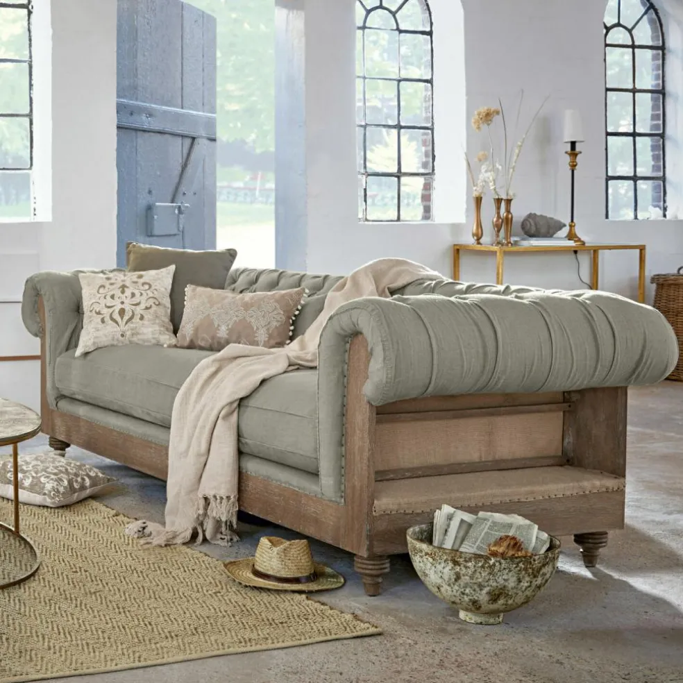 Le luxe dans un style shabby chic avec du charme et de la patine. Ce grand canapé prestigieux séduit par ses détails charmants avec ses côtés ouverts qui laissent entrevoir sa superbe structure en bois de chêne. La housse en lin noble est légèrement texturée. Les coutures décoratives et les rivets donnent encore plus de personnalité à l’ensemble. Les coussins déco inclus accentuent le côté douillet et cocooning du canapé. Ce véritable joyau de haute qualité ne manquera pas de séduire les amateurs d’originalité avec son style insolite et fascinant. Il se fondra parfaitement dans un style champêtre ou shabby chic. Asseyez-vous confortablement et laissez votre quotidien derrière vous. Profitez d’un bon film, d’un livre ou d’une agréable discussion. Le design généreux offre une assise suffisante pour accueillir plusieurs personnes. Offrez-vous une merveilleuse parenthèse avec ce petit bijou, que ce soit en solo, entre amis ou en famille. Un excellent choix pour les non-conformistes.