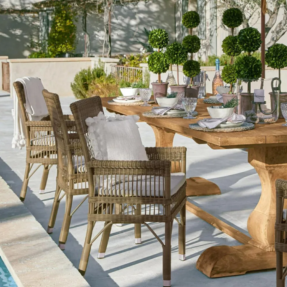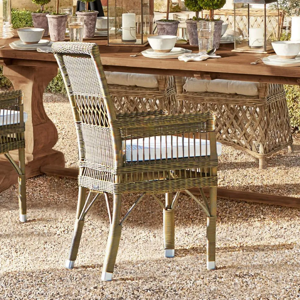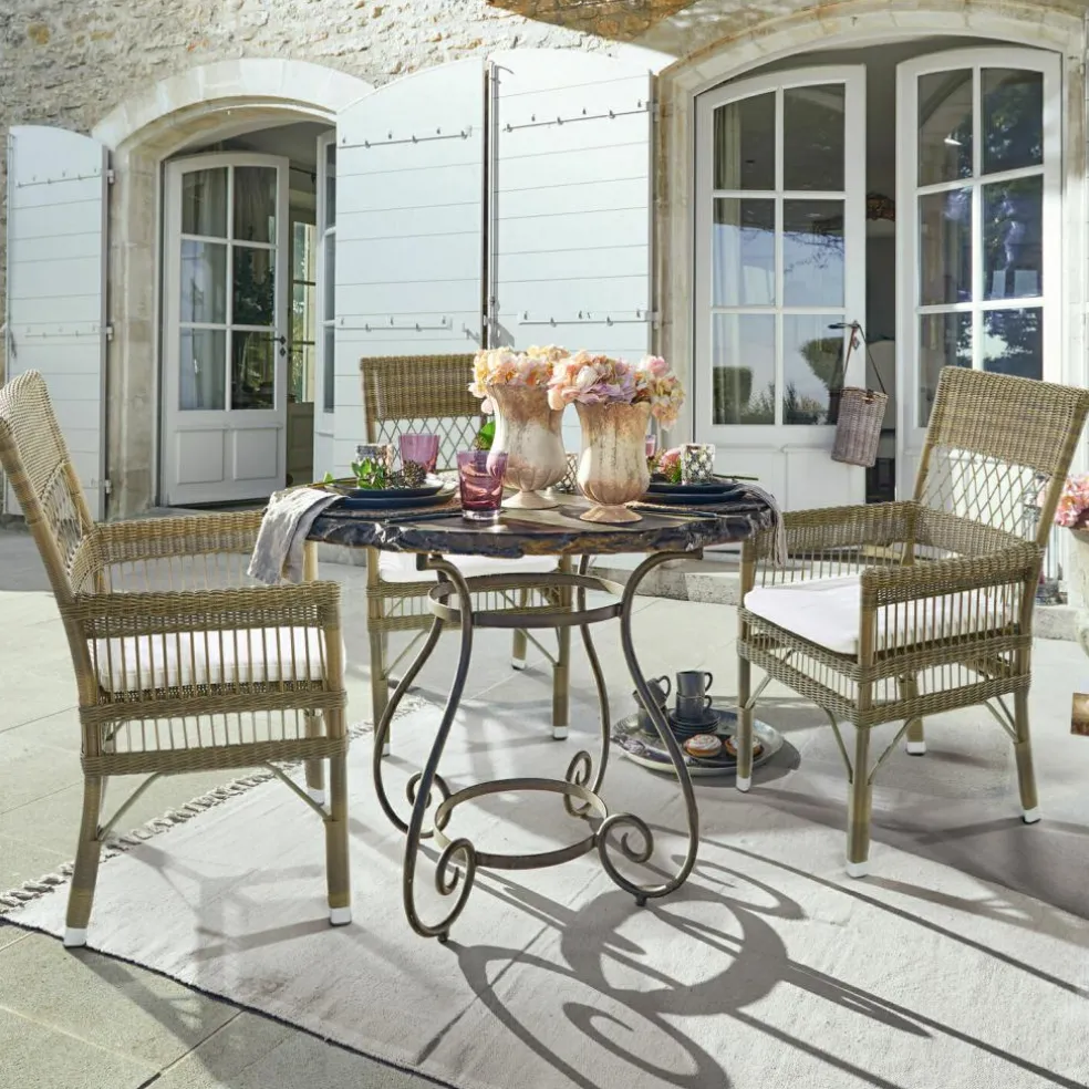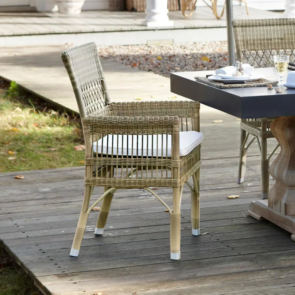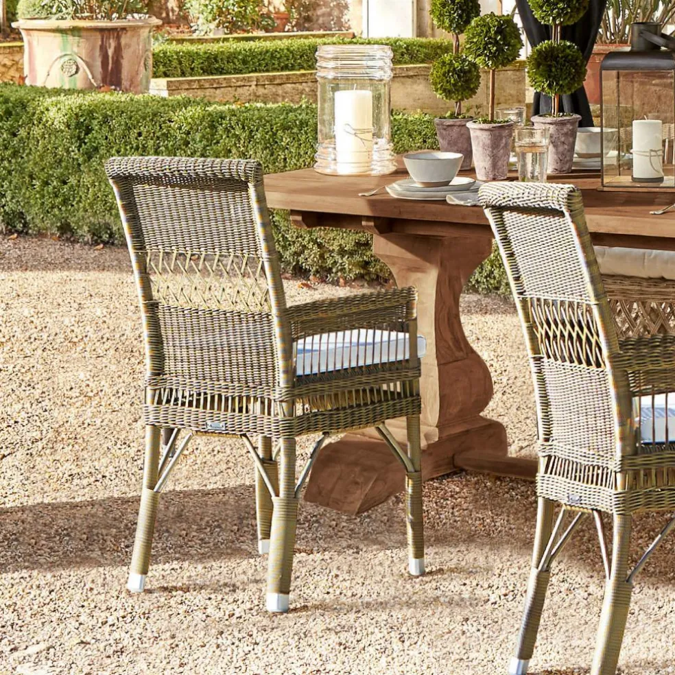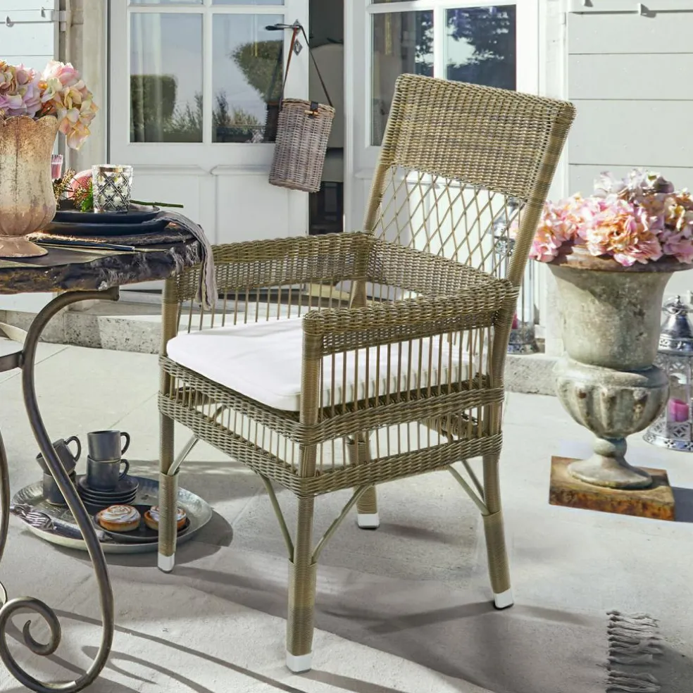 Cette chaise doit son aspect traditionnel à son tressage en fibres synthétiques Viro®, semblable au rotin. Ce matériau résiste aux UV, au gel et peut donc rester dehors toute l’année. Son cadre en aluminium, également résistant aux intempéries, assure une grande stabilité, tandis que le rembourrage moelleux en mousse et la housse en polyester offrent un confort optimal.
