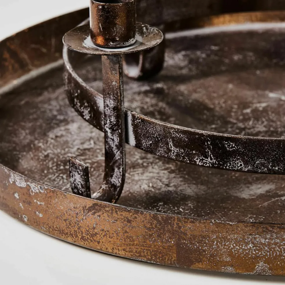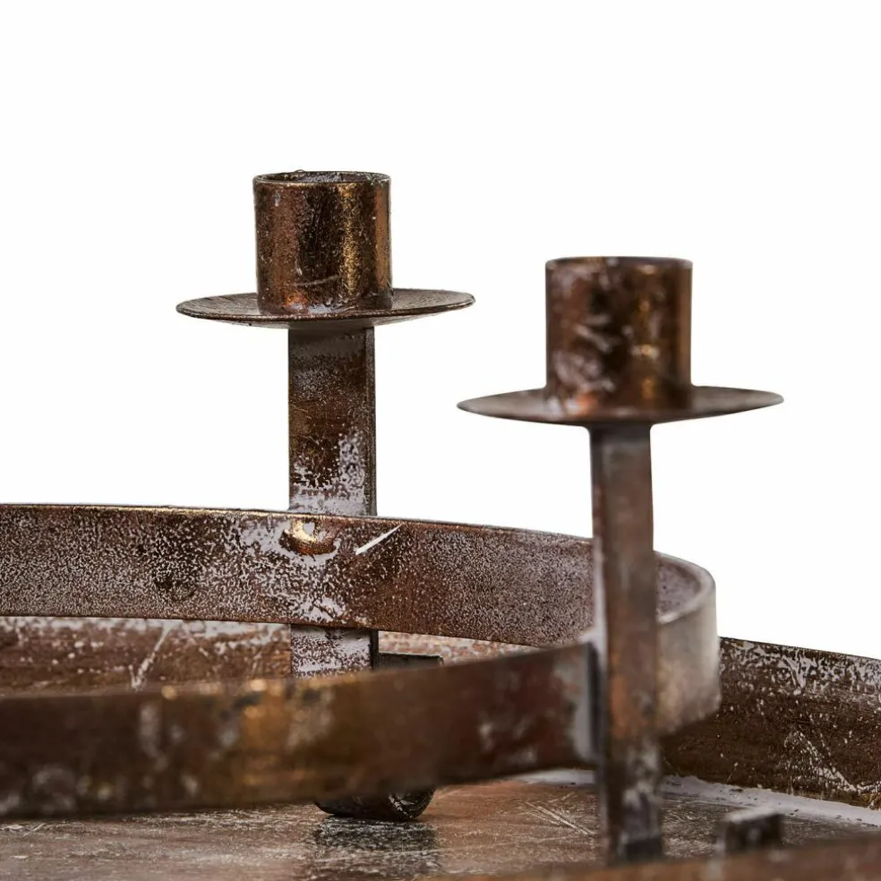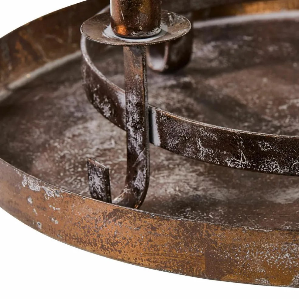 Le chandelier avec plateau est un superbe atout pour votre intérieur. Confectionnée dans un métal solide et ornée d’une finition rouille tendance, la couronne confère un charme rustique à chaque pièce. Sa patine unique lui assure une certaine originalité, parfait pour une ambiance cocooning. Utilisez-la comme élégante couronne de l’Avent ou comme pièce phare de votre décoration tout au long de l’année. La forme haute accueille quatre bougies bien installées sur le plateau. Sur la table à manger, la commode ou le buffet bas : ce chandelier attire vraiment tous les regards et vous permet de créer une ambiance des plus agréables. Les bougies ne sont pas comprises, libre à vous d’opter pour celles que vous préférez pour s’intégrer au mieux à votre chez-vous.