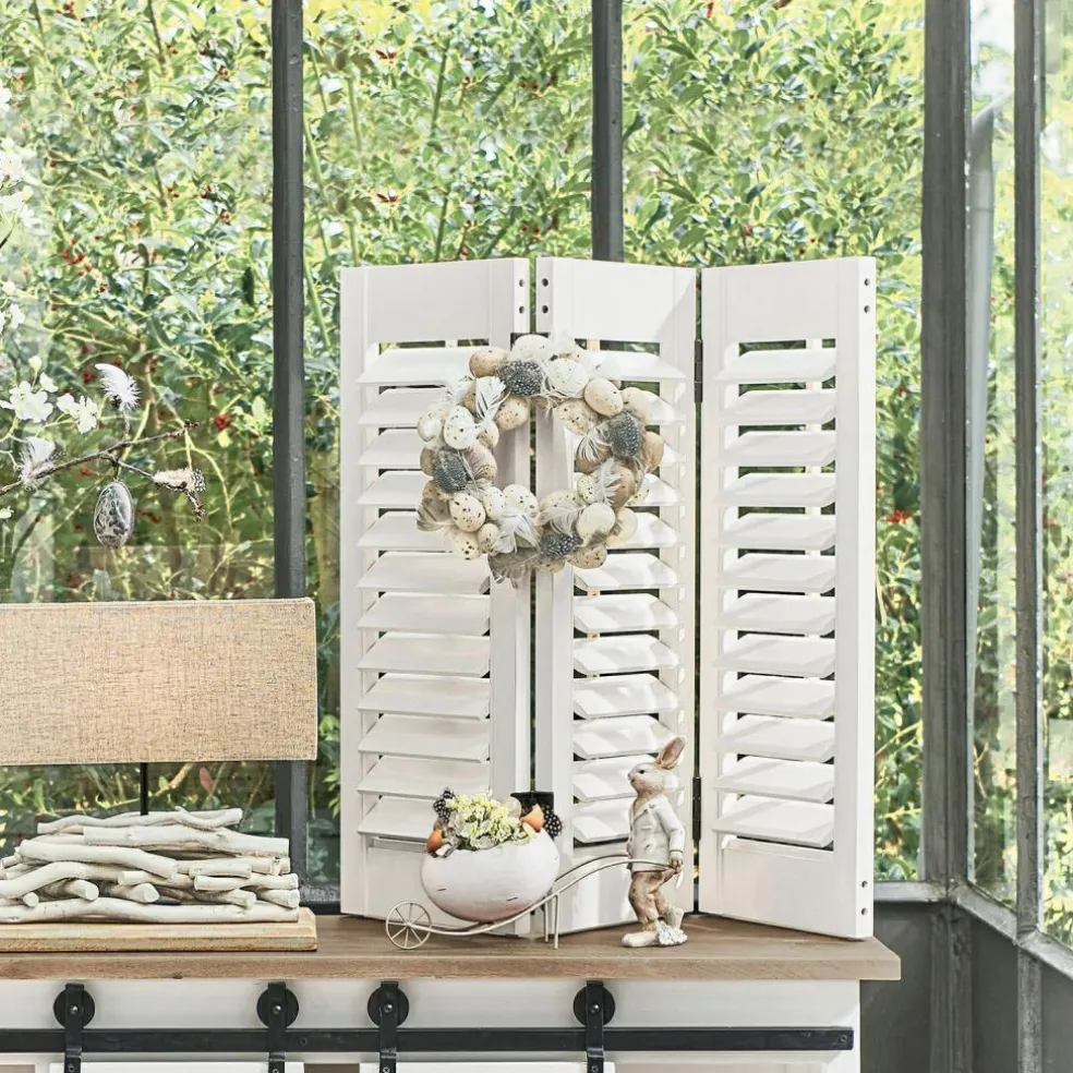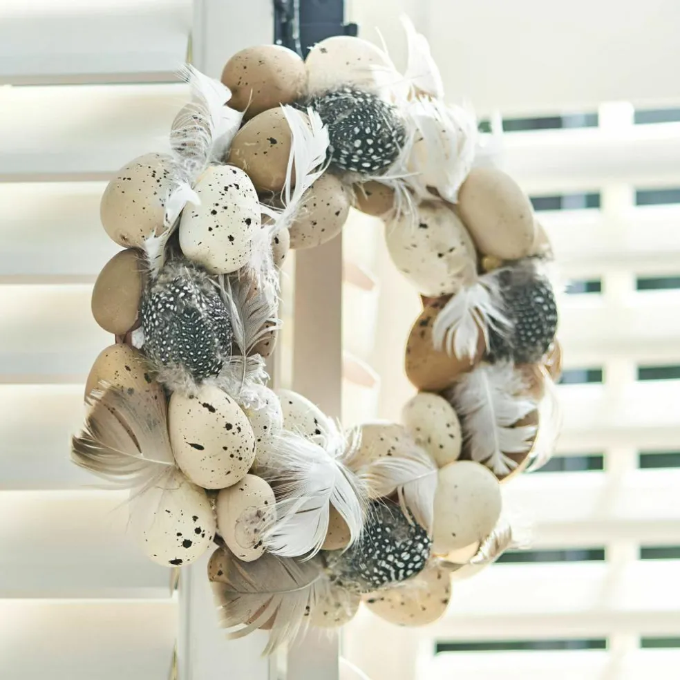 Cette jolie couronne de Pâques associe des plumes naturelles et des répliques d’œufs en trompe l’œil de grande qualité. Avec leurs taches de différentes couleurs, les œufs rappellent de petites friandises sucrées. Les plumes sont réparties tout autour de cette superbe couronne de Pâques. Confectionné à la main, ce petit bijou apporte la touche de décoration parfaite pour une porte, un mur ou des fenêtres au printemps. Plutôt que d’être peints avec des couleurs vives, les œufs évoquent un aspect naturel. La couronne adopte ainsi une allure discrète et élégante qui s’intègre parfaitement aux décorations de Pâques existantes sans leur voler la vedette.