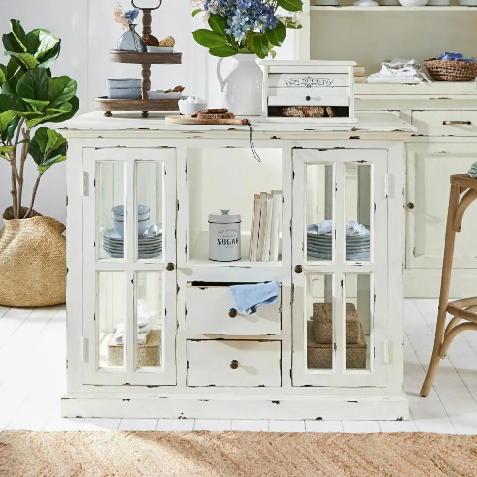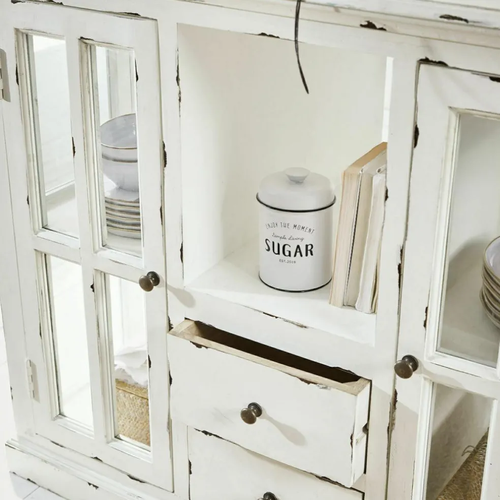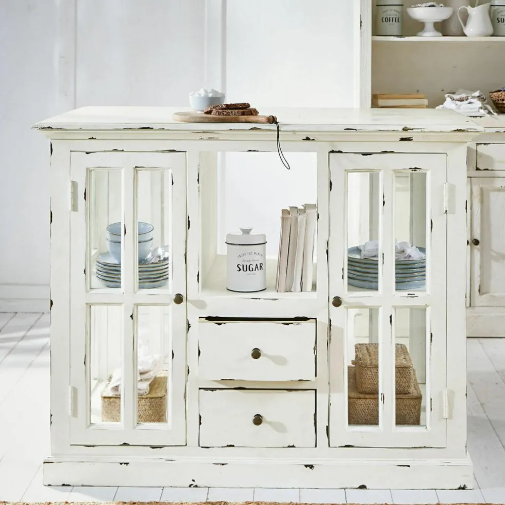 La vue de ce superbe meuble nous rappelle la bonne odeur du pain frais et des plats mijotés, accompagnée de l’arôme puissant des herbes provençales. Un délicieux mélange de parfums que l’on retrouve notamment dans les cuisines au style maison de campagne. Et cette desserte de cuisine joue un rôle non négligeable dans la réussite de vos petits plats car elle met son très grand plateau à disposition comme surface de travail et de rangement supplémentaire, tandis que la vaisselle et autres ustensiles de cuisine se tiennent prêts à être utilisés derrière les portes vitrées. La desserte de cuisine allie ces nombreux aspects pratiques avec un magnifique look nostalgique, qui ne manquera pas de contribuer à une atmosphère particulièrement détendue dans la pièce. En plus des portes à croisillons et des tiroirs avec des poignées en fonte, les authentiques traces d’usure confèrent à cette desserte de cuisine un charme unique. Particulièrement pratiques, les portes et tiroirs des deux côtés assurent d’avoir vraiment beaucoup d’espace de rangement. Les parties vitrées, quant à elles, vous permettent de voir parfaitement au travers et d’avoir ainsi une bonne vue d’ensemble de tous les ustensiles. Enfin, la qualité n’est pas en reste car cette desserte de cuisine a été fabriquée en bois de manguier selon les meilleures méthodes artisanales.