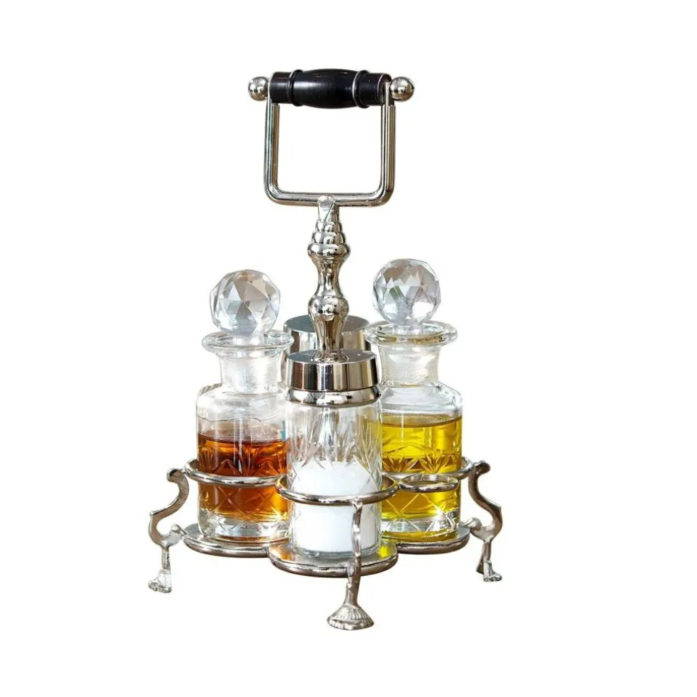 Cet ensemble assaisonnement prouvera votre bon goût à tous vos invités, même s’il n’est pas nécessaire d’ajouter beaucoup de condiments à votre repas. L’élégance de l’ensemble en verre de style ancien est en effet ravissant de toute manière. Les quatre récipients sont placés sur un présentoir en laiton de forme classique équipé d’une poignée pratique. Enfin, même un décor de table classique et élégant sera rehaussé par cet ensemble.
