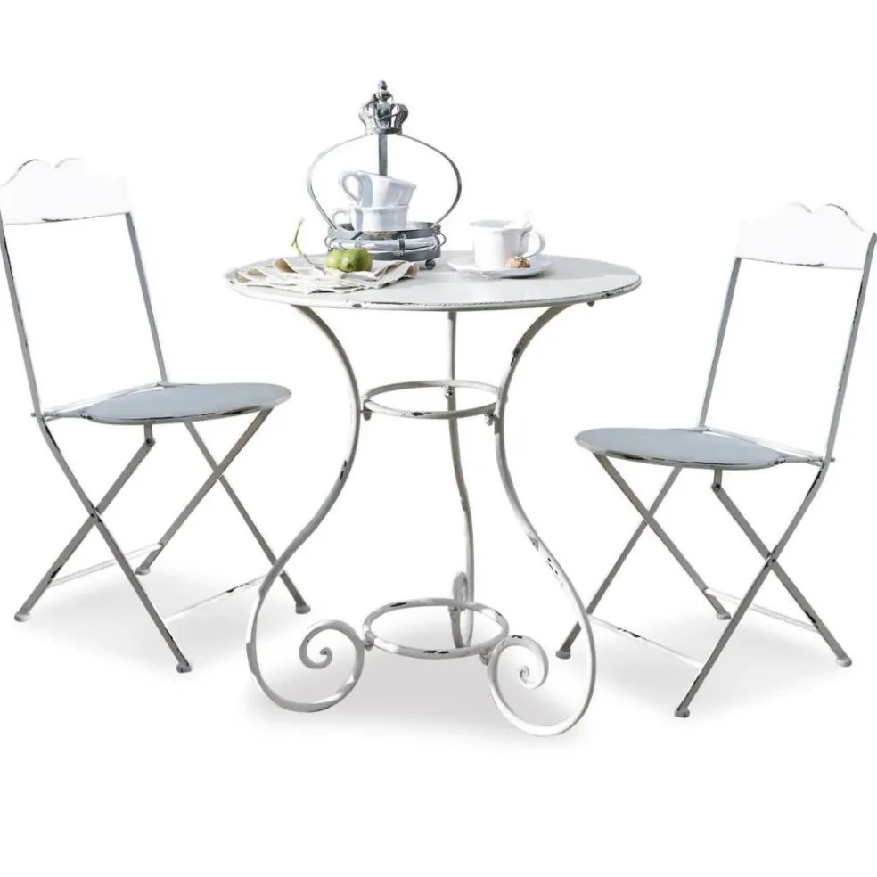 En fer aux lignes délicates avec une finition antique Ce charmant ensemble est composé de deux chaises pliantes et d’une table. Chaque pièce est réalisée en fer et séduit par son charme raffiné. Ce mobilier classique inspiré du 19e siècle est rehaussé d’une finition particulièrement charmante qui souligne encore son élégance.