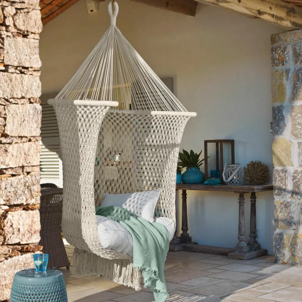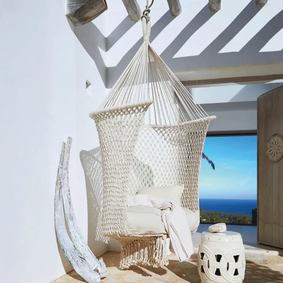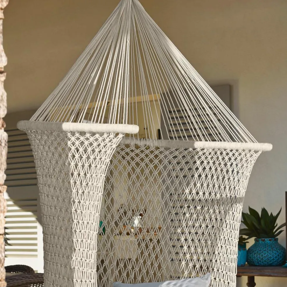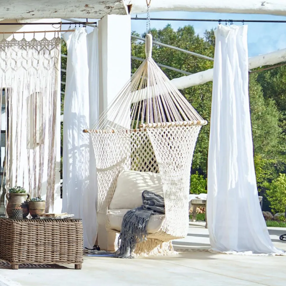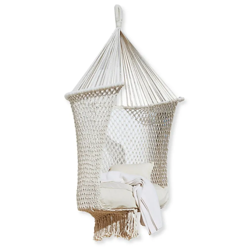 Pour passer d’agréables moments de détente. Délicat macramé en 100% coton entourant entièrement une tige stabilisatrice en métal. C’est comme si vous étiez en vacances : dans ce léger fauteuil à suspendre au charme estival, vous pourrez vous balancer et vous détendre en toute tranquillité. Oubliez l’agitation quotidienne dans ce fauteuil à suspendre qui vous aidera à vous relaxer et à refaire le plein d’énergie. Réalisé en 100 % coton, il est maintenu en forme par des tiges en bambou. Son design en coque donne la sensation de se trouver dans un petit cocon bien protégé. Filet en léger macramé réalisé à la main. Adonnez-vous au cocooning avec style. Détendez-vous à la maison, pour vous évader du stress quotidien. Le fauteuil à suspendre est livré avec un coussin de siège et un coussin dossier. Grâce à la boucle, vous pouvez le fixer partout : dans le jardin, sur la terrasse ou dans la maison. Si vous fixez un mousqueton à l’extrémité, vous pourrez même changer le fauteuil de place au gré des saisons ou de vos envies.