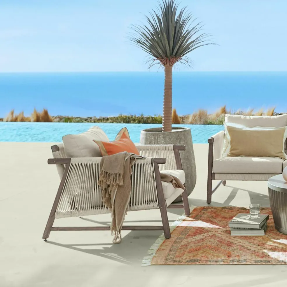 Ce fauteuil d’extérieur allie de manière unique un style intemporel et un confort fonctionnel. La structure en acacia séduit par sa solidité et son aspect naturel, tandis que le cordage en filigrane apporte une touche de modernité. Les coussins rembourrés invitent à la détente et sont revêtus de housses lavables en fibres d’oléfine résistantes et durables dans le temps. Que ce soit en solo ou en combinaison avec d’autres meubles, ce fauteuil deviendra à coup sûr l’endroit préféré de votre jardin ou de votre terrasse.