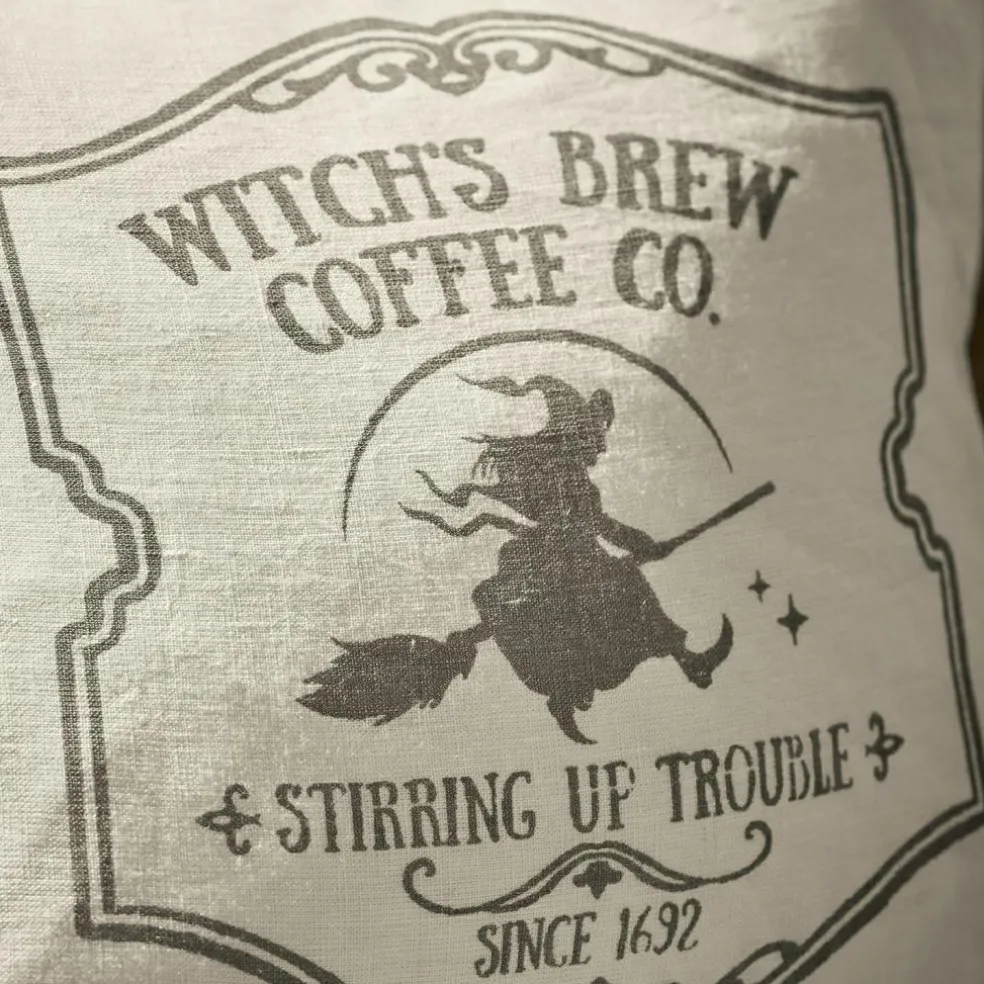 Une touche de magie et beaucoup de caractère : cette housse de coussin 100 % lin joue sur l’esthétique vintage et l’humour. L’imprimé noir sur fond blanc naturel rappelle les anciens panneaux publicitaires et donne envie d’un bon café avec, bien sûr, un petit coup de baguette de sorcière. Le tissu au tissage grossier dégage une authenticité rustique. Que ce soit pour Halloween ou simplement pour attirer l’attention de manière originale au quotidien, ce textile apporte une charmante touche de trouble, selon la devise : « Stirring up trouble since 1692 ».