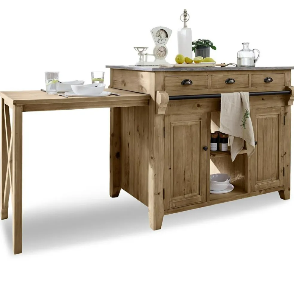 La star de la cuisine? Ce meuble est parfaitement pensé, c’est clair. Ce buffet au style champêtre de rêve régale la vue avec sa finition vieillie authentique et de jolis détails comme les poignées raffinées sur les tiroirs. Mais outre son aspect, cette pièce se distingue par l’espace qu’elle offre. Par exemple avec la petite table qui s’extirpe du côté. Vous obtenez ainsi en quelques secondes un magnifique espace de travail supplémentaire. Vos enfants veulent peut-être vous aider en cuisine? Aucun souci, de nombreux ustensiles trouveront leur place dans le vaisselier. Trois tiroirs, une tablette au milieu et de nombreux compartiments derrière les portes, avec chacun son étagère, offrent de la place pour la vaisselle. Sur la tringle, des torchons peuvent joliment être suspendus. La finition de grande qualité –le vaisselier est principalement constitué de bois de sapin revalorisé– en font un compagnon résistant à l’usure. Un point de mire intemporel.