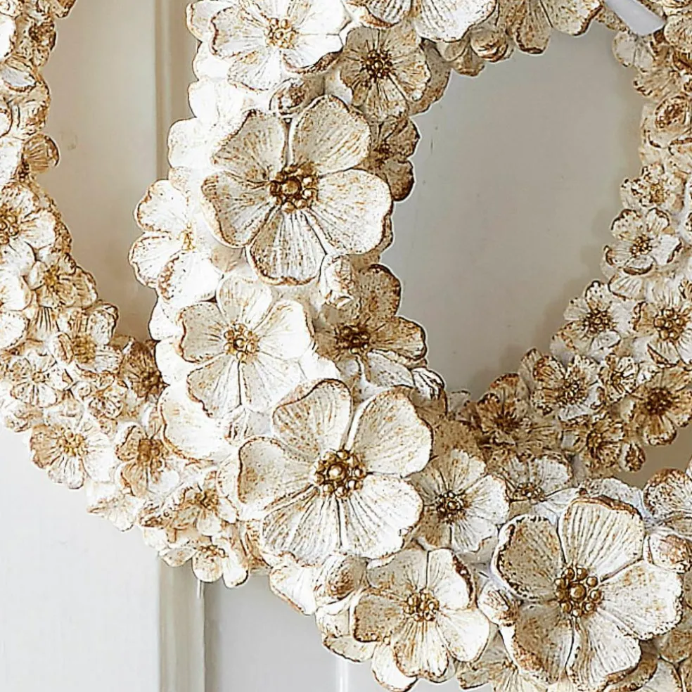 Les merveilleuses fleurs qui ornent ces deux magnifiques couronnes sont plus vraies que nature. Elles ont été fabriquées exclusivement en résine synthétique, un genre de pierre reconstituée qui est parfaite pour les sculptures délicates et les objets décoratifs. La finition vieillie appliquée à la main apporte une touche de nostalgie et un aspect doré et chatoyant aux fleurs. Vous pourrez ainsi admirer cet accessoire au charme original tout au long de l’année. Ce duo romantique s’intègre particulièrement bien dans une ambiance vintage et propose de nombreuses idées déco – il pourra orner un mur ou une porte, être posé sur une étagère ou encore constituer la pièce centrale sur une table de banquet.