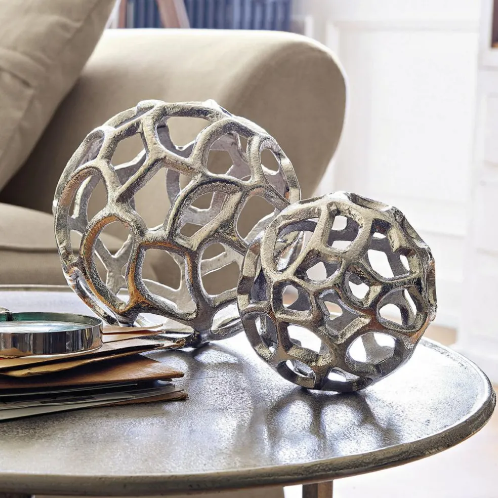 Travail d’art en aluminium coulé. Un joli duo en deux tailles. Nombreuses possibilités de décoration. Ces superbes boules au style intemporel sont parfaites pour décorer une table, un buffet ou un plateau. Posées seules sur un meuble, elles feront autant d’effet que si vous disposez des fleurs, des branches, des cristaux ou d’autres beaux objets autour d’elles. Leur aspect serein et harmonieux rehaussera n’importe quel intérieur. Admirez tout au long de l’année ces objets raffinés ! Au gré de votre fantaisie, vous pourrez aussi fixer un lien aux boules pour les suspendre.