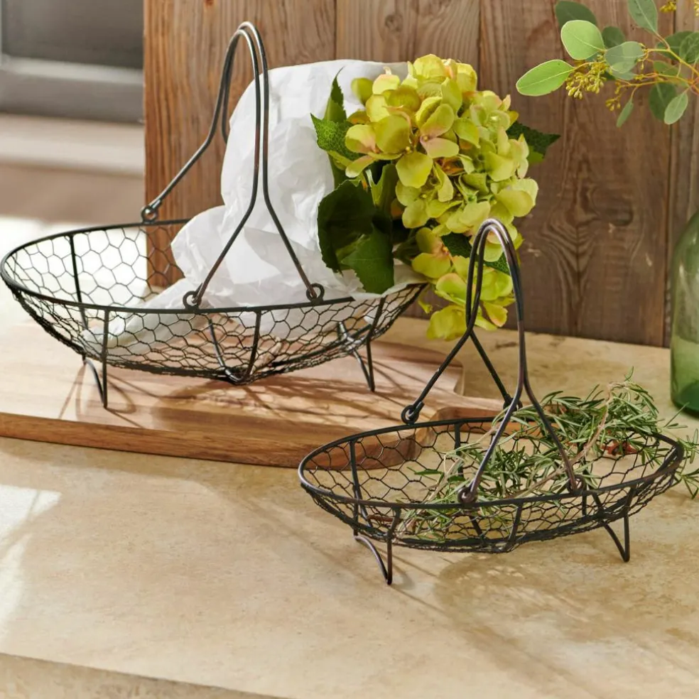 Métal et style vintage. Parfait pour les fruits, les légumes et la déco. Lot composé de deux tailles. Ces deux jolis corbeilles avec anse sont aussi pratiques que décoratives Vous pourrez les utiliser par exemple pour transposer les légumes du jardin à la cuisine ou pour créer de jolies décorations à la maison. Elles peuvent accueillir des pommes, des courgettes ou même des petites citrouilles dans la cuisine ou en décoration sur la table. Des bouquets de fleurs séchées et autres jolis accessoires y seront joliment mis en valeur tout en conférant une touche vintage à votre intérieur.